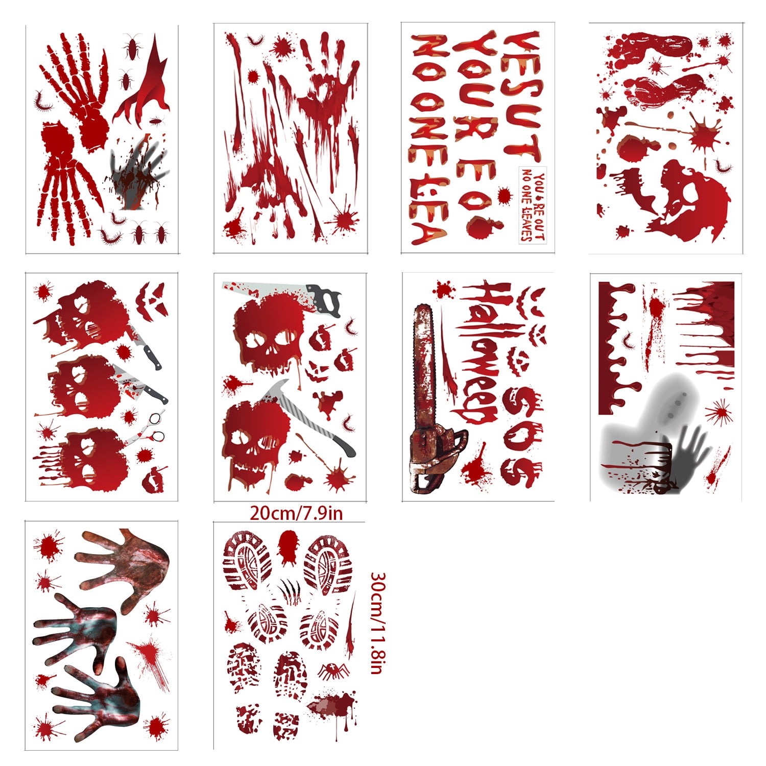Versatile Bloody Decor : They have stylish designs (splatter, drops, and prints). Show a bit of your spooky side with bloody handprint window clings that easily adhere to any smooth surface, including mirrors, fridges and even floors.