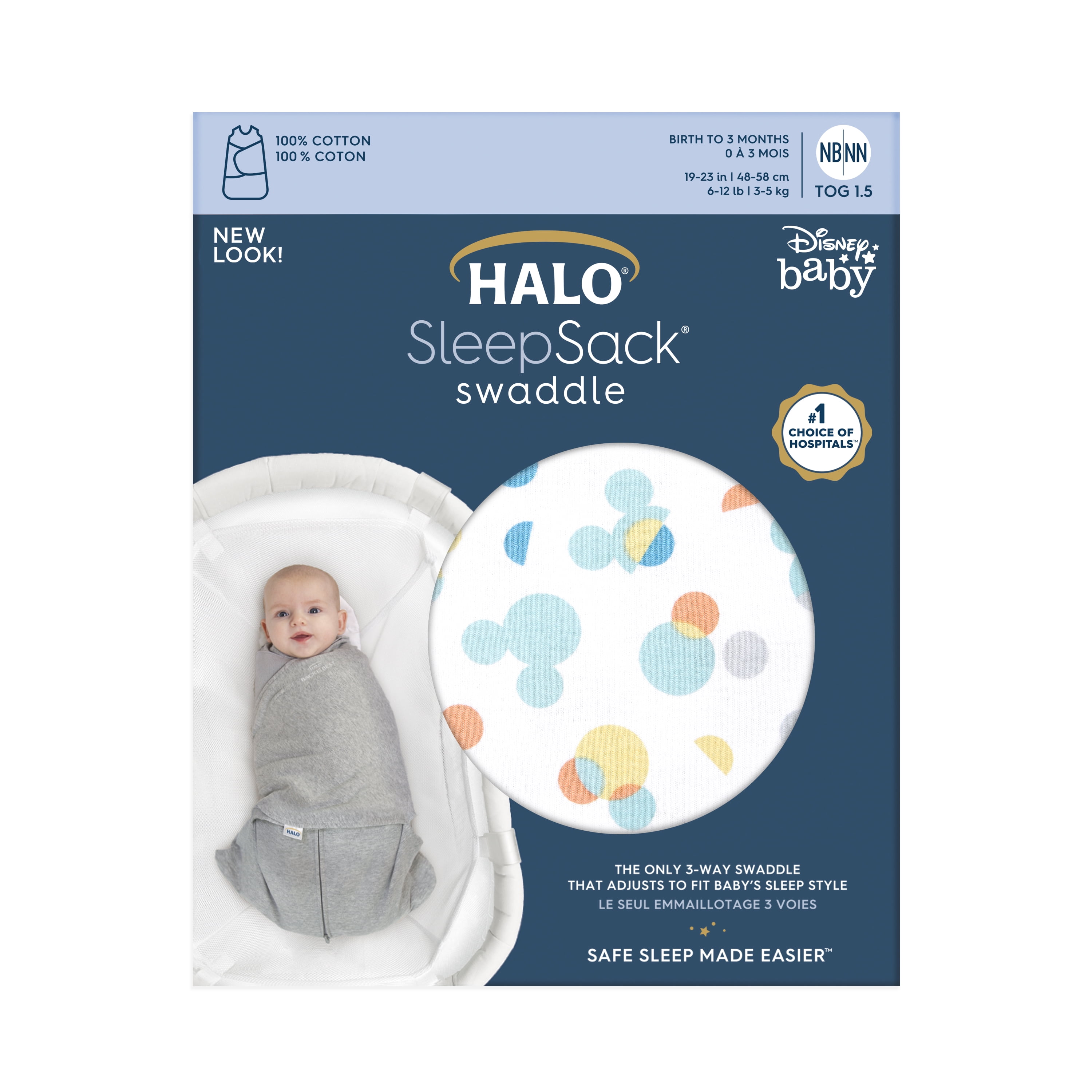 Disney’s most famous characters join HALO® SleepSack® swaddle to make safe sleep the happiest sleep on earth. Our 3-way adjustable swaddle now comes in 4 exclusive Disney designs, featuring classic icons Mickey and Minnie in endearing contemporary designs. Swaddle with arms in, hands-to-face, or with one or both arms out. Nestles baby like a soft blanket, without the risk of sleep-related dangers. Signature “Back is Best” embroidery is a gentle reminder to place baby in the recommended sleep position. Features a 2-way zipper for easy diaper changes and a roomy sack design that’s recognized by the International Hip Dysplasia Institute as promoting healthy hip development.