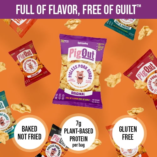 If you love “traditional” pork rinds, you’ll love our Addictively Delicious™ Original flavor, packed with 7g of plant-protein per serving, baked till light and crispy, and seasoned carefully to create an authentic pork taste. PigOut® Pigless® Pork Rinds deliver all the flavor and texture of “traditional” pork rinds but are entirely plant-based and free of gluten, GMOs, soy, and trans fats!