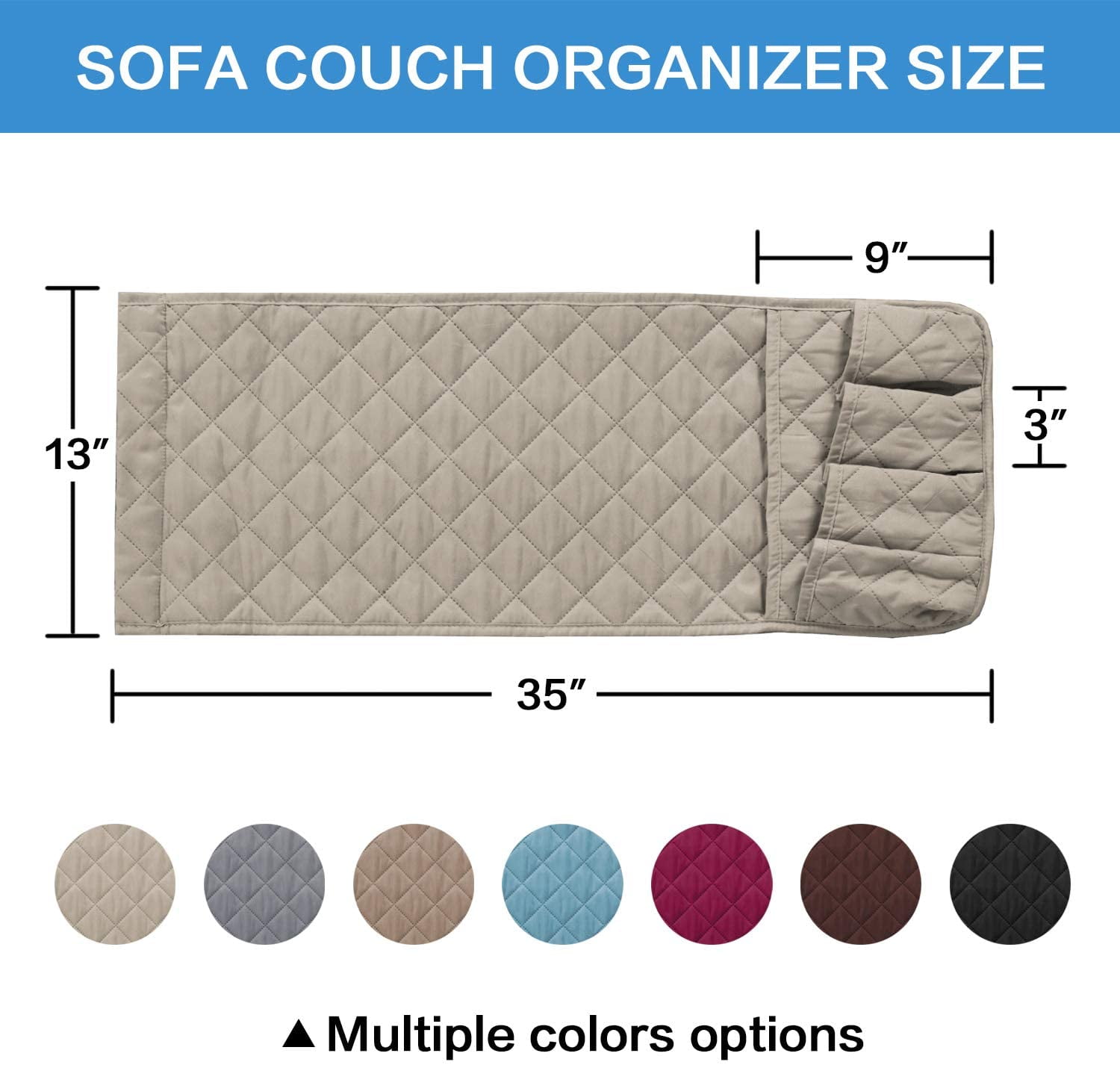 - UNIVERSAL SIZE: Sofa Armrest Organizer is 35*13 inches/90*34cm, fits for most couch, recliner, sofa. It’s a good organizer and protector for the arms of your furniture, stay in place firmly and hassel free for starage small stuff again