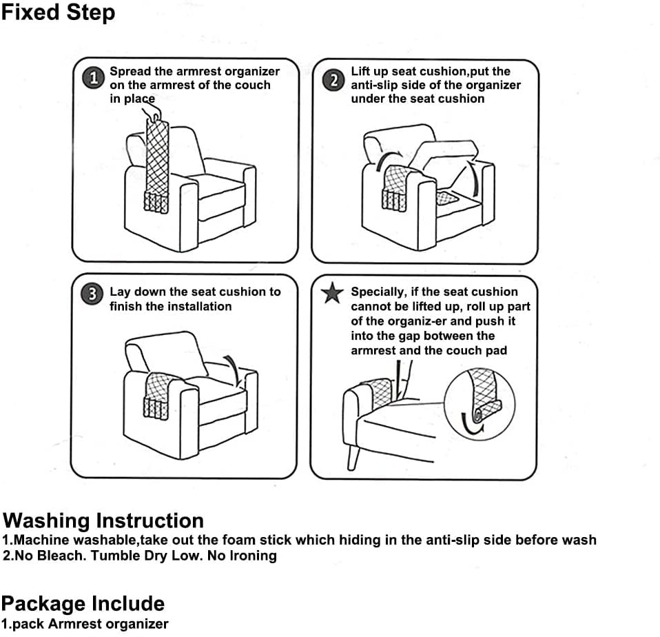 – The storage bag has a built-in tube, you can stuff into the gap between the sofa and armrest to make it held under the seat cushion, so that it does not slide and roll.