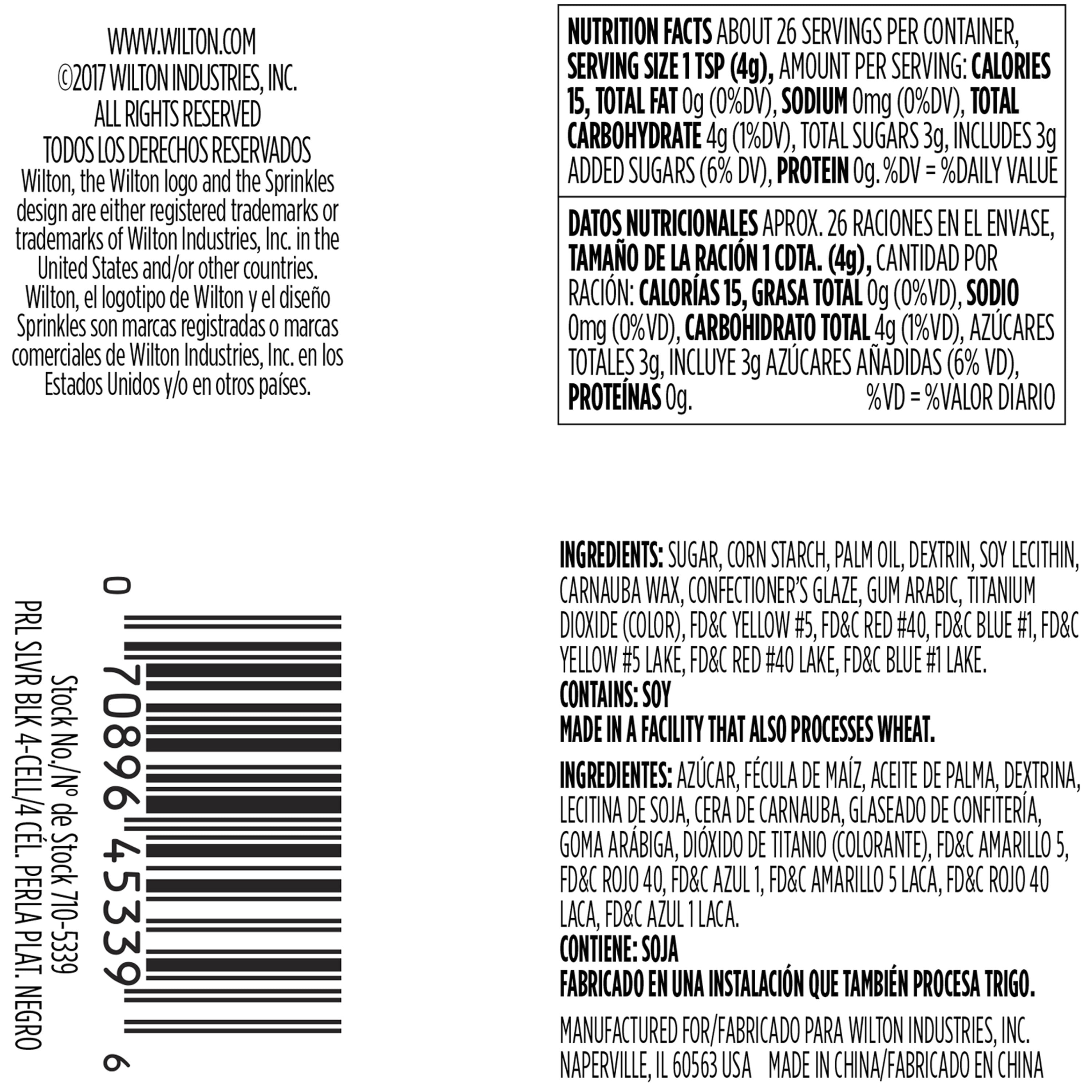 Top cakes, cookies, cupcakes and other treats with this Wilton 4-Cell Black, White and Silver Sprinkles Mix. Great for New Year’s Eve, elegant bridal and baby showers, birthdays and more, this sprinkles mix is a fun way to add color and texture to your desserts. This mix of sprinkles contains white, black and silver nonpareils; silver metallic sprinkles; black and white jimmies; and black metallic sprinkles. Try them on cookies, cupcakes, brownies, even ice cream! Each variety of sprinkle is packaged individually with its own lid, so you can use one at a time or mix and match sprinkles for a fun look.