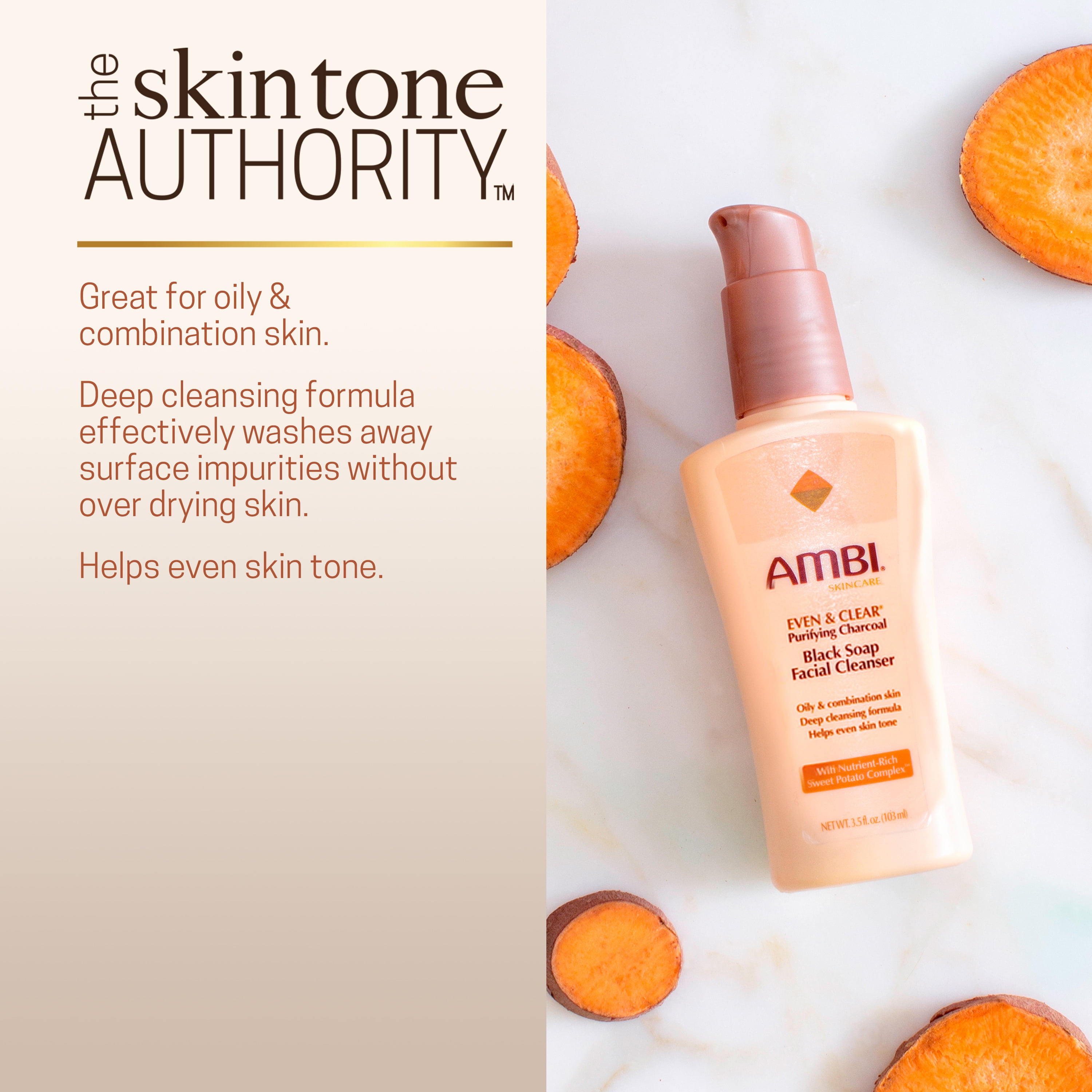 Experiencing the purifying power of Ambi Even & Clear Purifying Charcoal Facial Cleanser. Formulated with oil-absorbing charcoal to help wash away surface impurities, this black soap face wash harnesses the power of shea butter to provide the perfect moisture balance to the skin to combat over-drying. This charcoal pore cleanser also features our proprietary, nutrient-rich Sweet Potato Complex™. Known as a "beauty food," sweet potatoes are power-packed with antioxidants and Vitamins A, C and E that help fight hyperpigmentation and promote healthy, glowing and even-toned skin. Ambi provides scientifically-proven skincare products to help achieve beautiful, healthy-looking, clear skin. You can trust Ambi, the Skin Tone Authority™.