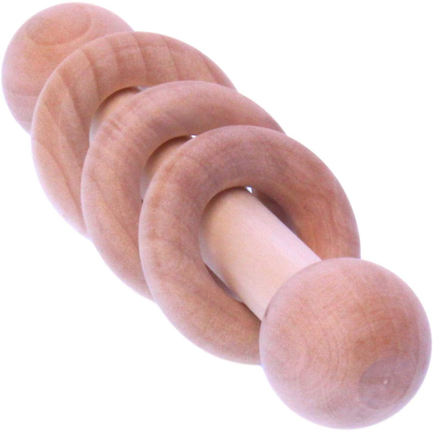 This Baby Rattle is an excellent, natural toy. The rattle is crafted of unfinished wood. No harmful toxins for your baby! This adorable 5” rattle is crafted by the Amish in Topeka, Indiana.