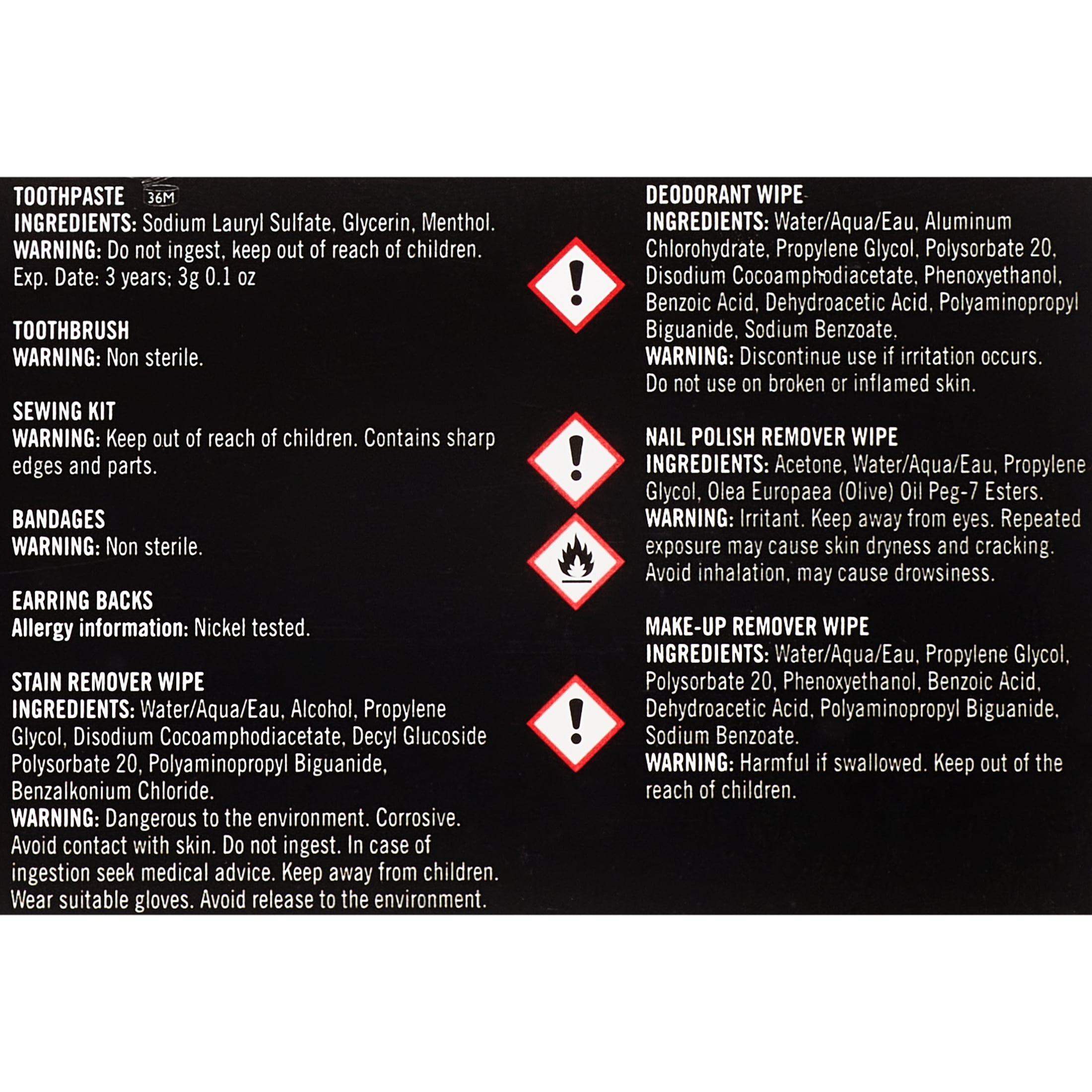 Everyday Kit contains: ⢠Toothbrush & toothpaste ⢠Tissues x 2 ⢠Shower cap ⢠Vanity kit (cotton swab x 4, cotton pad, nail file) ⢠Hair band ⢠Hair clips x 2 ⢠Sewing kit ⢠Compact mirror ⢠Bandages x 2 ⢠Double-sided tape ⢠Tweezers ⢠Earring backs x 2 ⢠Cleansing wipe ⢠Deodorant wipe ⢠Nail polish remover wipe ⢠Make-up remover wipe . A DANIELLE CREATIONS EXCLUSIVE! What every girl needs in an emergency! Wardrobe malfunction or last minute hot date? This kit has just the solution! Available in 4 luminous colours, perfect for the most chic damsels.
