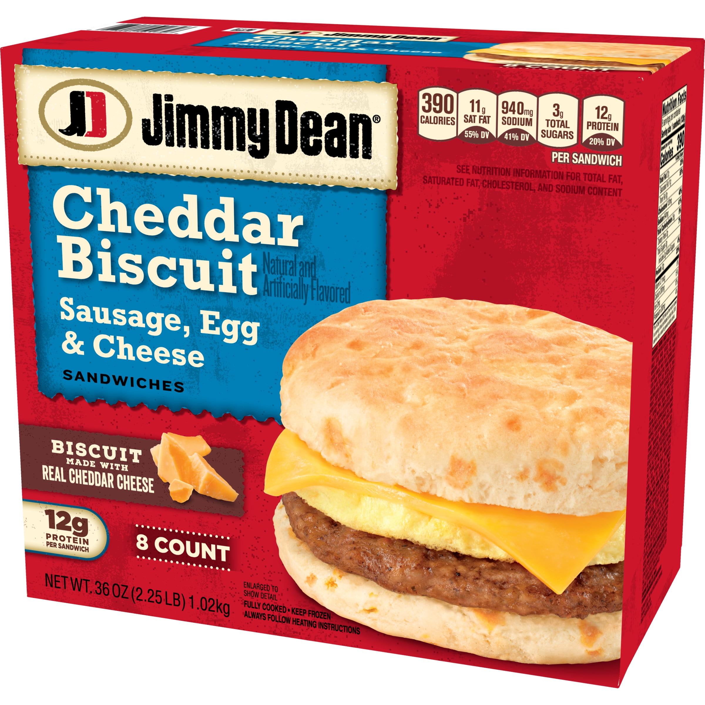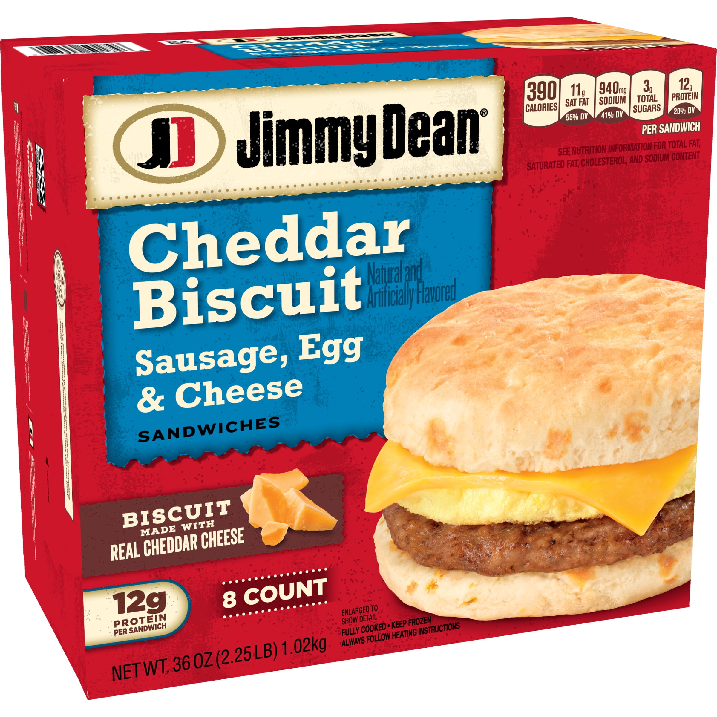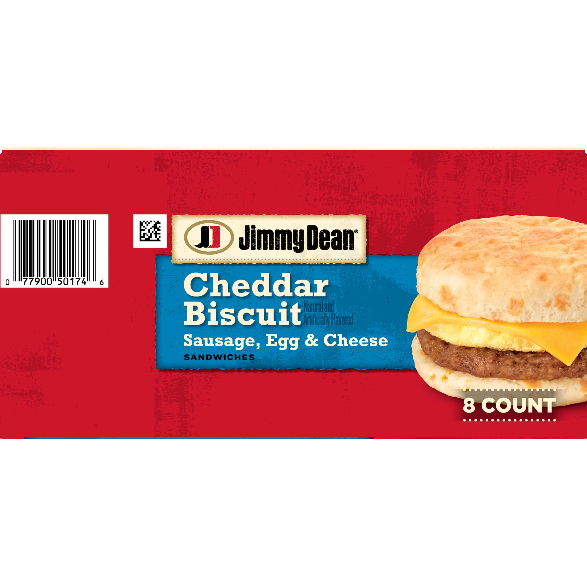- One package of 8 Individually wrapped Jimmy Dean Sausage, Egg & Cheese Cheddar Biscuit Sandwich