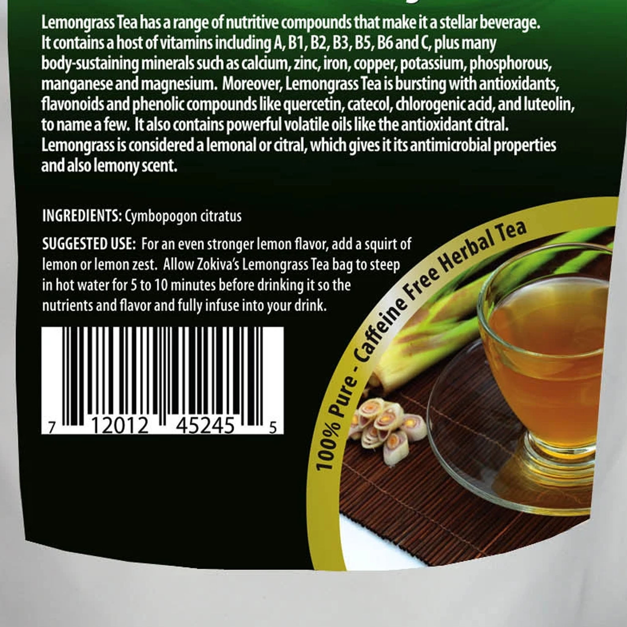 Lemongrass Tea Lemongrass Tea comes from the tall blades of Lemongrass, which is in the Poaceae family of grasses. It has variety of culinary and beauty applications, but it is most highly regarded for its medicinal properties. Lemongrass Tea is bursting with a range of vitamins – A, the spectrum of B vitamins and C – as well as the mineral compounds iron, potassium, zinc, calcium, phosphorus, manganese, magnesium and copper. COUNTRY OF MANUFACTURE: USA INGREDIENTS: Cymbopogon citratus SUGGESTED USE: Lemongrass Tea is an excellent drink – morning, noon or night. To experience its full dose of nutrients and delicious lemony flavor, steep one Zokiva Lemongrass Tea bag in hot water for 10 minutes. Then enjoy plain or with your favorite tea toppings. Be sure to drink plenty of water as Lemongrass Tea is a diuretic. Lemongrass Tea will be most effective when combined with a healthy diet and regular exercise. If you are pregnant or breast-feeding you should consult with a doctor before use. If you are on any medications check with your doctor, or pharmacist before taking any supplement. These statements have not been evaluated by the FDA. This product is not intended to diagnose, test, cure or prevent any disease.Lemongrass tea contains powerful nutrients