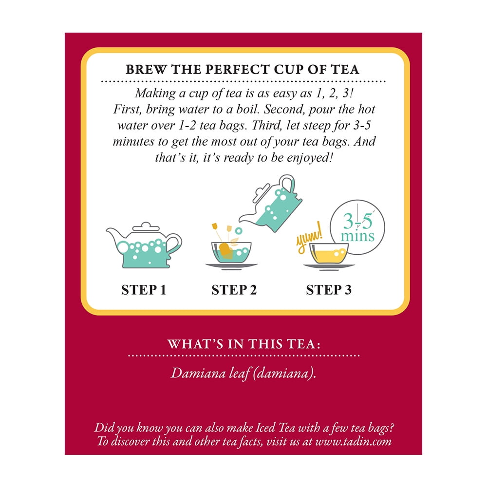 - FLAVOR AND AROMA NOTES: Tadin’s Damiana Herbal Tea blossoms with uplifting floral notes, deep woodsy, & hints of sweet hay.