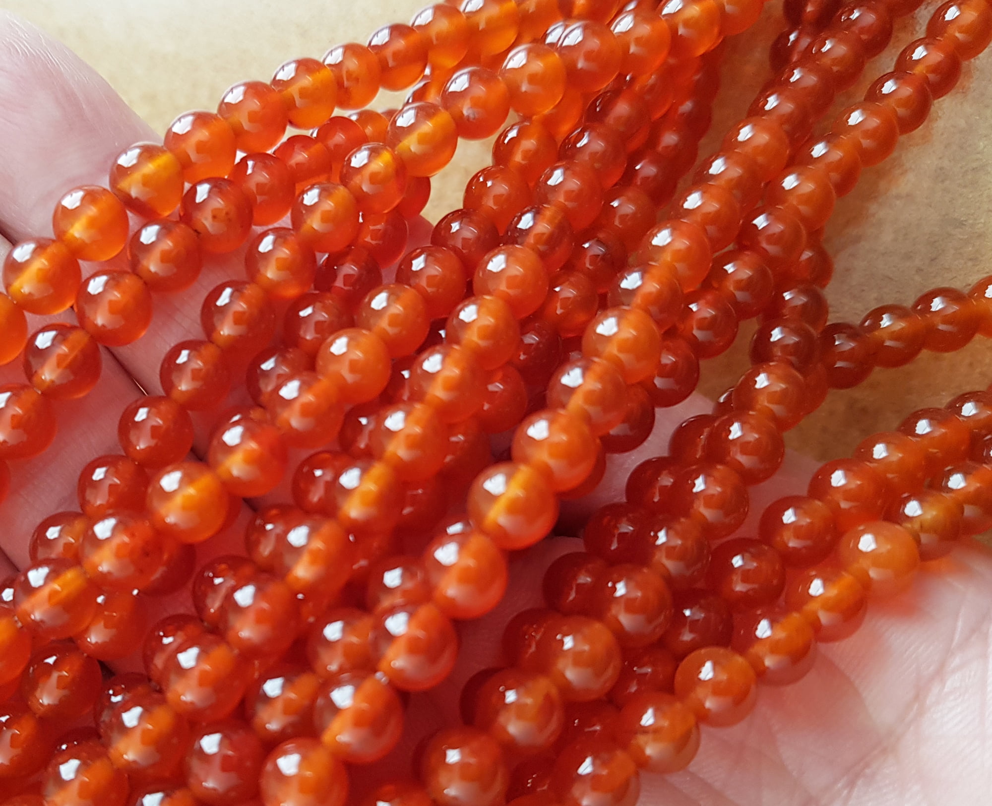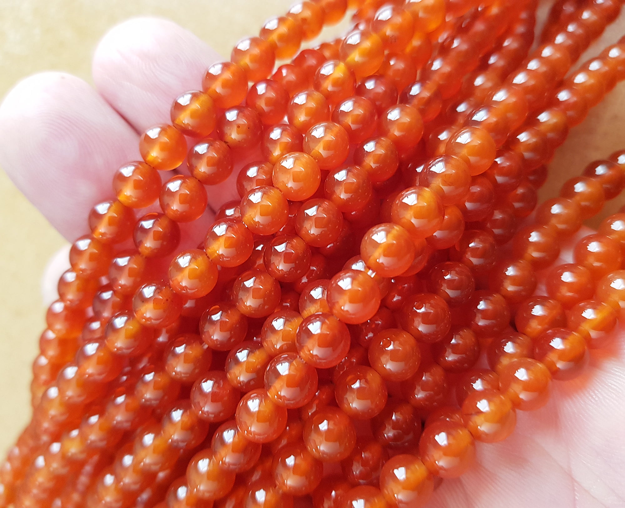 15.5 inch long strand. The carnelian round beads are of good quality. The bead size is approx. 6mm in diameter. There are about 63 beads per strand. The beads are heat-treated and color-enhanced permanently.