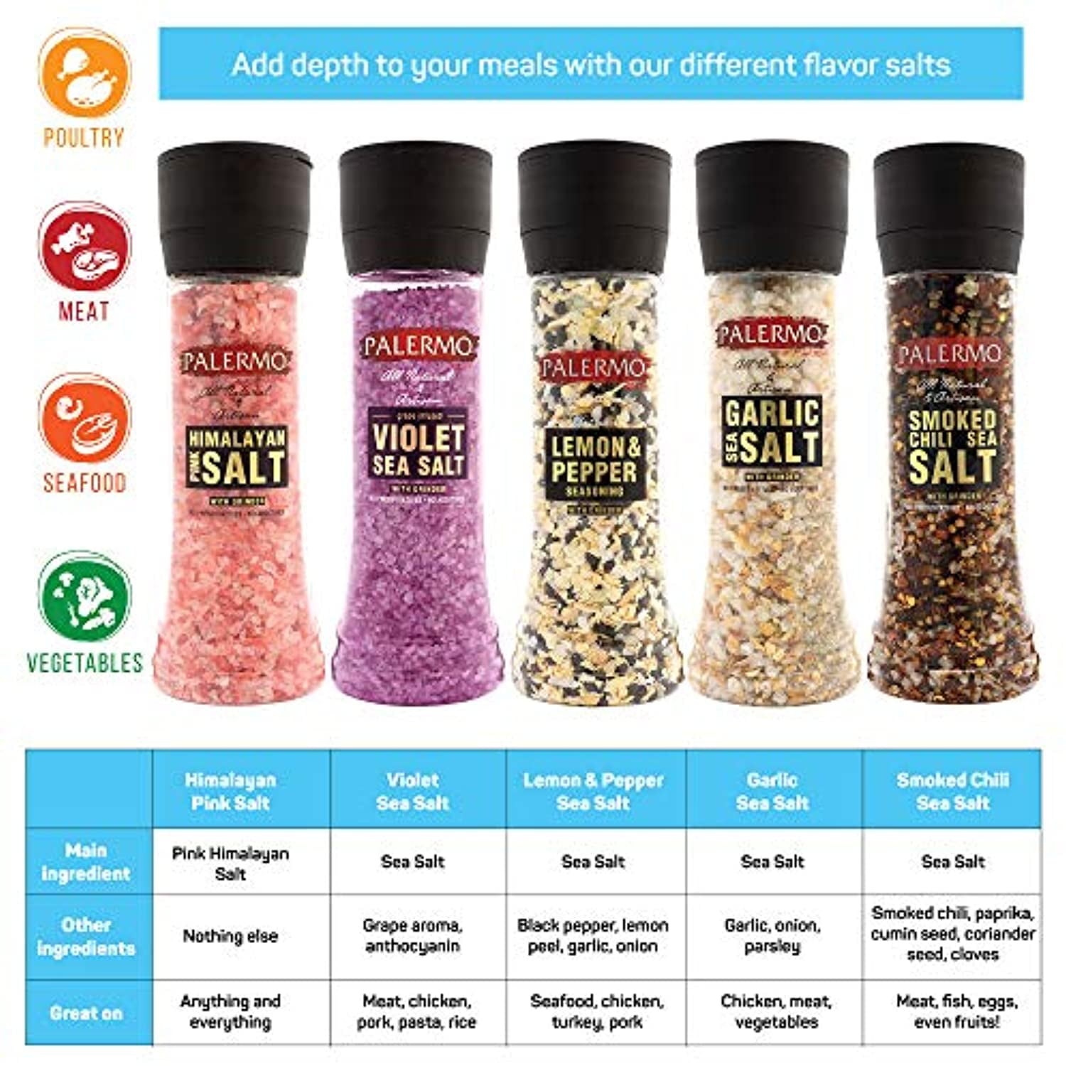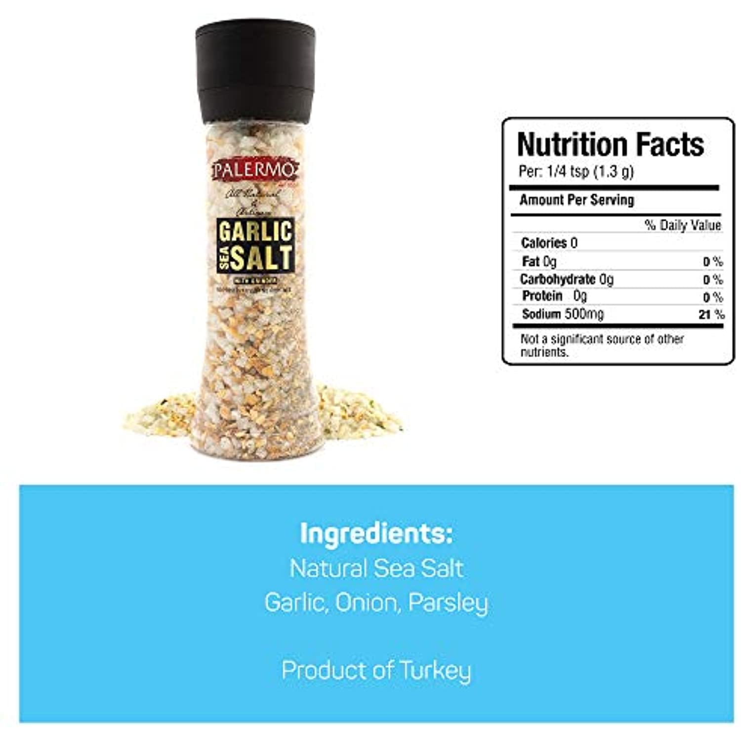 -Natural Sea Salt, garlic, onion, and parsley -No artificial flavors, preservatives or colors added9oz Palermo Garlic Sea Salt
