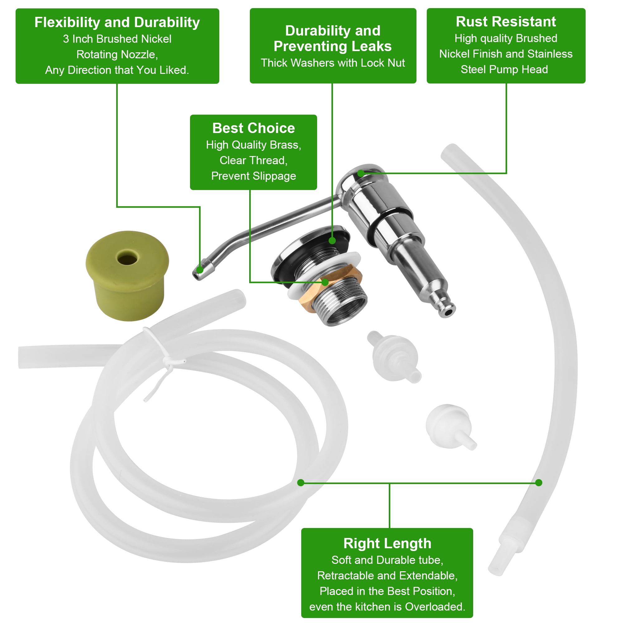- 【HIGH QUALITY MATERIAL】The soap dispenser for kitchen sink includes ALL BRASS PUMP HEAD and anti-corrosive food-grade silicone extension tube.