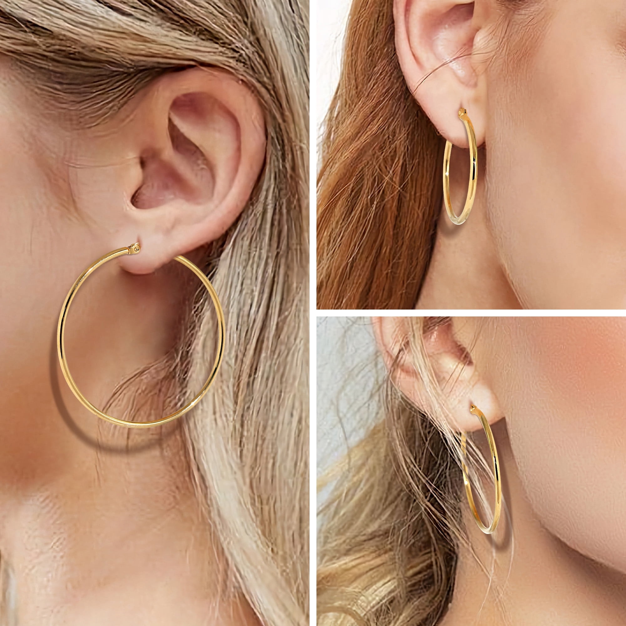 AFFORDABLE PRICE+MULTIPLE CHOOSE:6 pairs of earring in 6 diameter :Diameter Option:10mm,15mm,20mm,30mm,40mm,50mm.Color option: steel silver tone,rose gold tone.The sizes are just perfect for daily outfit.