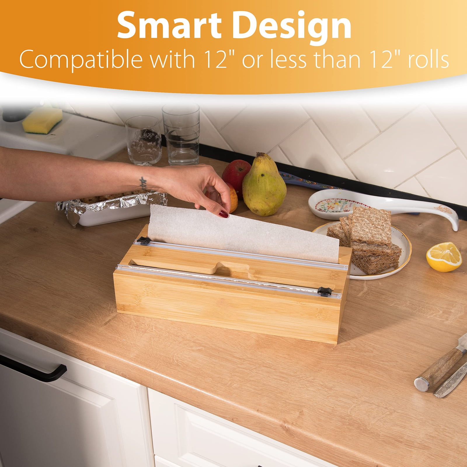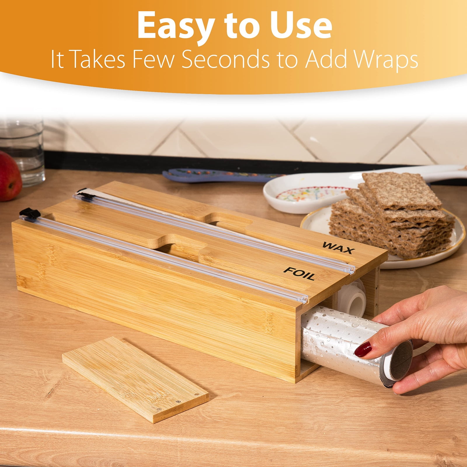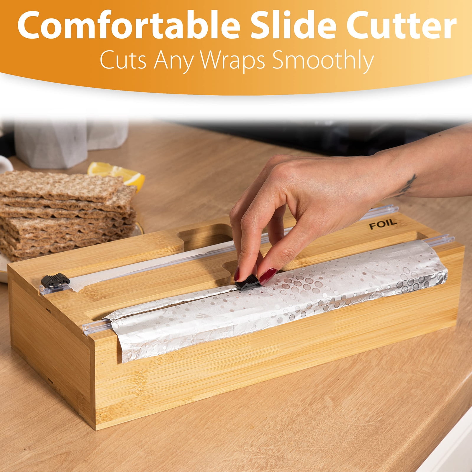 - CUT THE CLUTTER and have perfect kitchen drawer organization with our food wrap dispenser with cutter. Perfect for Aluminum foil, saran wrap, plastic wrap, cling wrap, wax paper and more. Your kitchen organization and storage will be that much better!