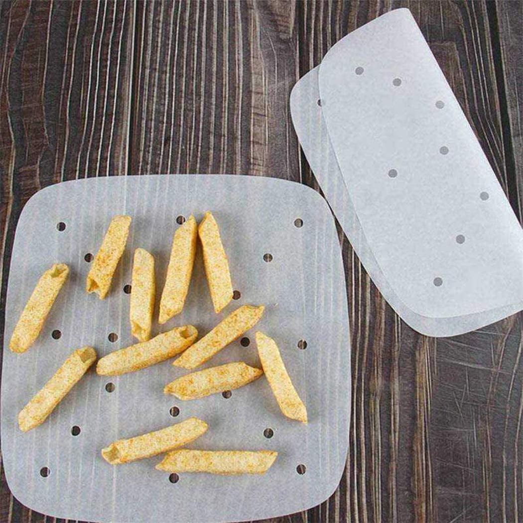 3. Make sure you have enough food or other items on the pad to prevent them from flying off or getting scalded by the heat!Please preheat the lining and place it in an air fryer.Doingart Air Fryer Liners 100pcs Parchment Paper Square Unbleached Non Stick Steamer Mat Perforated Cooking Sheet Liners for Baking