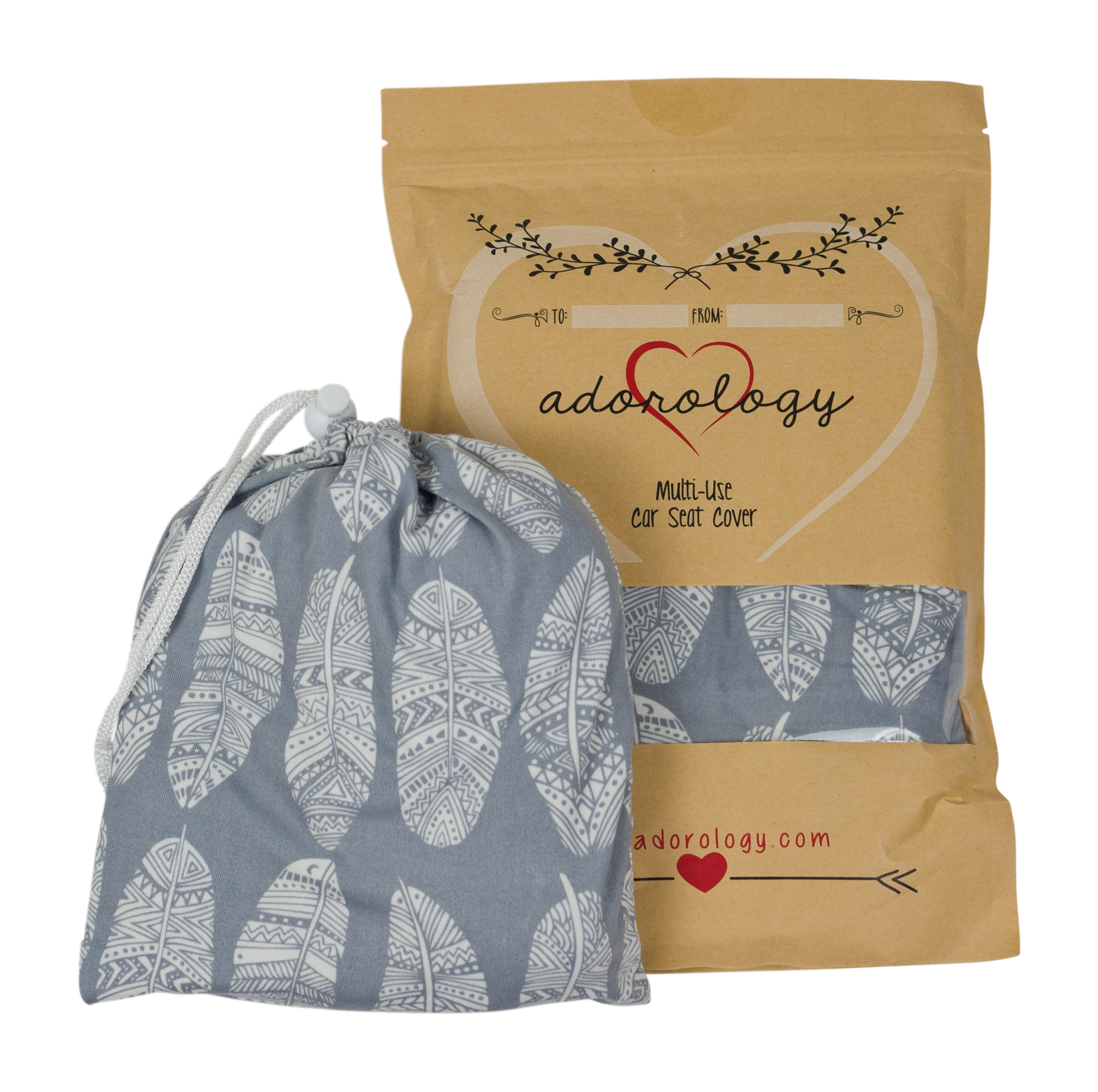 - This set includes a soft and stretchy car seat cover in gray with white feathers plus a drawstring carry bag and a cute resealable gift ready package. This will make a perfect baby shower gift!