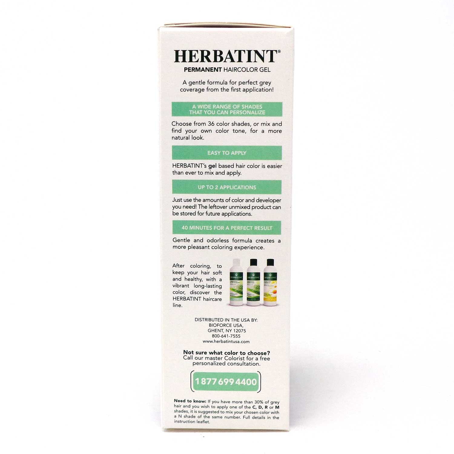 Permanent Herbal Haircolor Gel, Plum FF3 4.5 fl oz (135 ml) Since 1970. With aloe vera. No resorcinol. No ammonia. Covers grey hair. For one or two applications. This Package Contains: 1 bottle Herbatint haircolor gel flash fashion (2 fl. oz. (60 ml)), 1 bottle Glycol Developer (2 fl. oz. (60 ml)), 1 Sample of either shampoo or Royal Cream Conditioner (0.5 fl. oz. (15 ml)), 1 Pair of gloves, 1 leaflet containing directions for use. Against animal testing. Made in Italy. Please read enclosed directions carefully before applying. Your hair must be dry and unwashed! 1) Using a plastic or a glass container, combine equal and sufficient amounts of Herbatint gel and the Glycol Developer to suit the length and volume of your hair. Replace the caps on the bottles containing unused products, and retain for future use. For long hair, use the whole amount. 2) Using a brush, apply the mixture onto dry unwashed hair. 1st Case: Previously Colored Hair. 3) Apply the mixture to the regrowth area and leave to develop for 30 minutes. 4) Then apply the remainder of the mixture through the rest of the hair and wait a further 10 minutes. (total processing time: 40 minutes). 2nd Case: Uncolored Hair. 3) Apply the mixture through the whole length of the hair starting at the roots. For best coverage use a tinting brush as supplied in a Herbatint Tinting Kit. Discard any unused mixture. 4) Leave to process for 40 minutes. During processing, the color of the product may differ from your target color, this is quite common and doesn’t have any effect on the final color. 5) Once processed rinse hair thoroughly until the water runs clear. 6) Shampoo your hair, using preferably a shampoo from the Herbavita range for best results, rinse and towel dry. 7) Apply the Royal Cream Conditioner, leave for 5 minutes, rinse again and style your hair as usual. For best coverage of grey hair, it is advisable to mix 20 ml of the N color of the same shade. On uncolored hair, flash fashion colors can lighten by up to two shades. This product contains ingredients which may cause skin irritation on certain individuals and a preliminary patch test, according to accompanying instructions, should be made prior to each application. This product must not be used for dyeing eyelashes or eyebrows. To do so may cause blindness. Avoid contact with your eyes. Should mixture come into contact with eyes, rinse immediately with cool water. Wear the enclosed gloves during application. 4.5 fl oz (135 ml) Hudson, NY 12534 800-641-7555