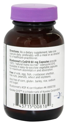 Bluebonnet Nutrition CoQ10 60 mg – 60 Vegetarian Capsules Bluebonnet Nutrition CoQ10 provides 100% natural trans-isomer, yeast-fermented form of Ubiquinone that is identical to the body”s own Co-Q10. Bluebonnet Nutrition CoQ-10 is imported from Japan in easy-to-swallow vegetarian capsules for maximum assimilation and absorption. Bluebonnet Nutrition CoEnzyme Q10 is a lipid-soluble, vitamin-like substance that is present in nearly all human tissues and is essential for the cellular processes of energy production in the mitochondria. Bluebonnet Nutrition CoEnzyme Q-10 functions as an antioxidant in both the mitochondria and lipid membranes by either scavenging free radicals directly or in conjunction with tocopherol. While Ubiquinone is the fully oxidized and most common form sold commercially, once ingested and absorbed in the body-most of it is converted to its reduced, active antioxidant form called Ubiquinol. In the plasma of healthy humans, more than 90% of CoQ10 exists in the reduced, active antioxidant form Ubiquinol and accounts for the largest percentage of CoQ10 found in the heart, intestines and liver. However, many factors have been found to compromise the levels of Ubiquinol in the body: the normal aging process, certain medications, oxidative stress, etc. For example, as the body ages, it not only produces less CoQ10, but it is less able to convert the common, non-active form of CoQ10 (Ubiquinone) to the more readily available, active form (Ubiquinol). Therefore, providing the active antioxidant form of CoQ10 (Ubiquinol) – especially to seniors – will ensure that they are getting a form that their bodies can immediately utilize. Dietary sources high in CoQ10 include liver, beef, chicken and some oils. Superoxide dismutase (SOD) is the most powerful and important antioxidant enzyme, protecting and defending the body against negative elements that damage cells promoting cellular health and immune function.Bluebonnet CoQ10 60 Mg., 60 Ct