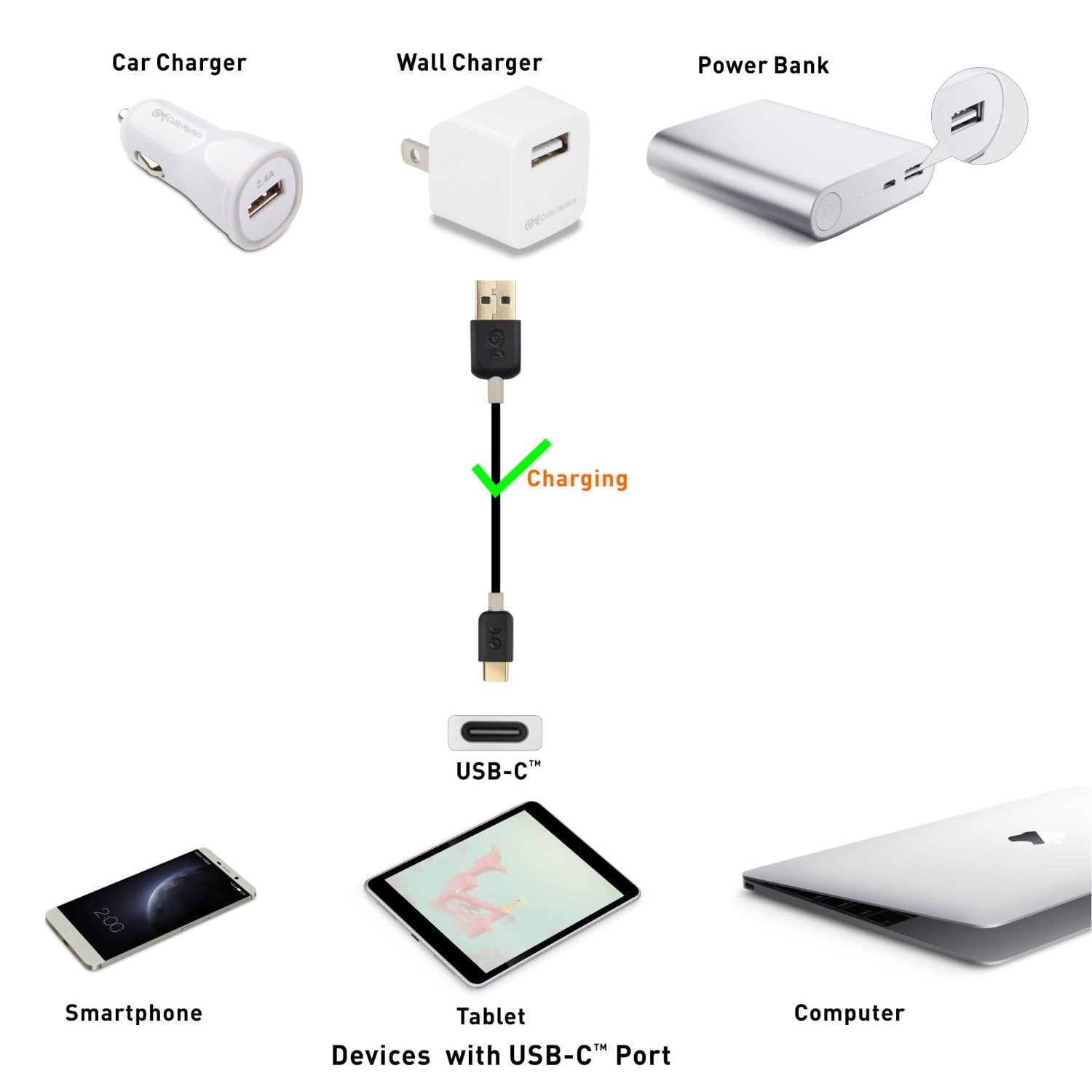 The Cable Matters USB 2.0 Type-A to Type-C cable provides a convenient connection between legacy USB chargers/computers with USB-A and the newest releases of smartphones and tables with USB-C. It connects computers with a USB Type-A port to newer smartphones and tablets with the small form factor USB Type-C connector.