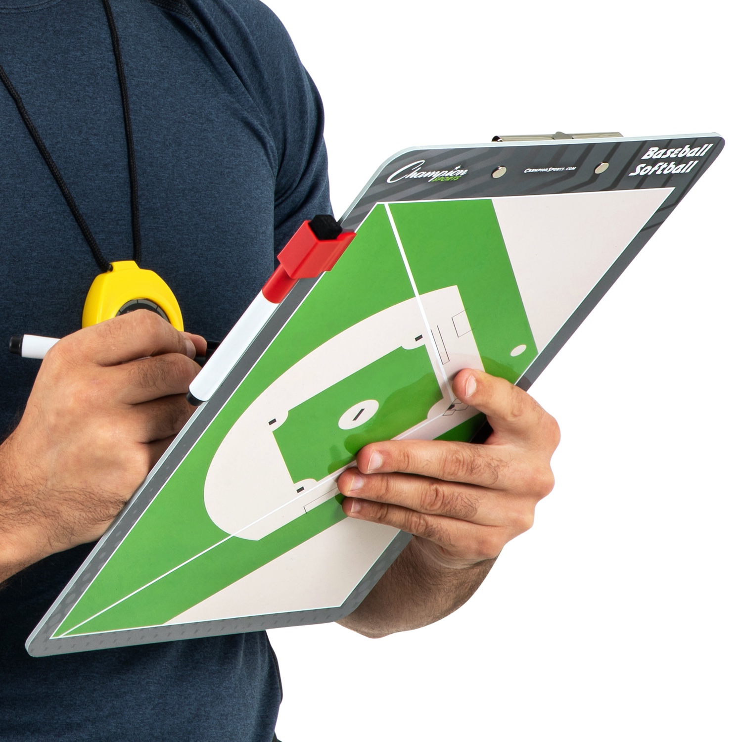 Get the most out of every inning with the Champion Sports Baseball and Softball Coaches’ Board. This coaching board features a full basbeball diamond on one side and a batting line up on the other, so you can easily work on batting order and keep track of the team line up, making changes as you go. Complete with a dry erase marker and clip to hold your papers, this dry erase board will help you and your team stay organized throughout games and practices.