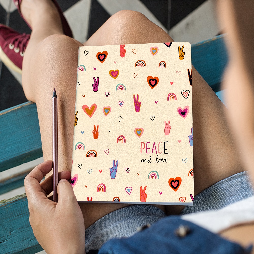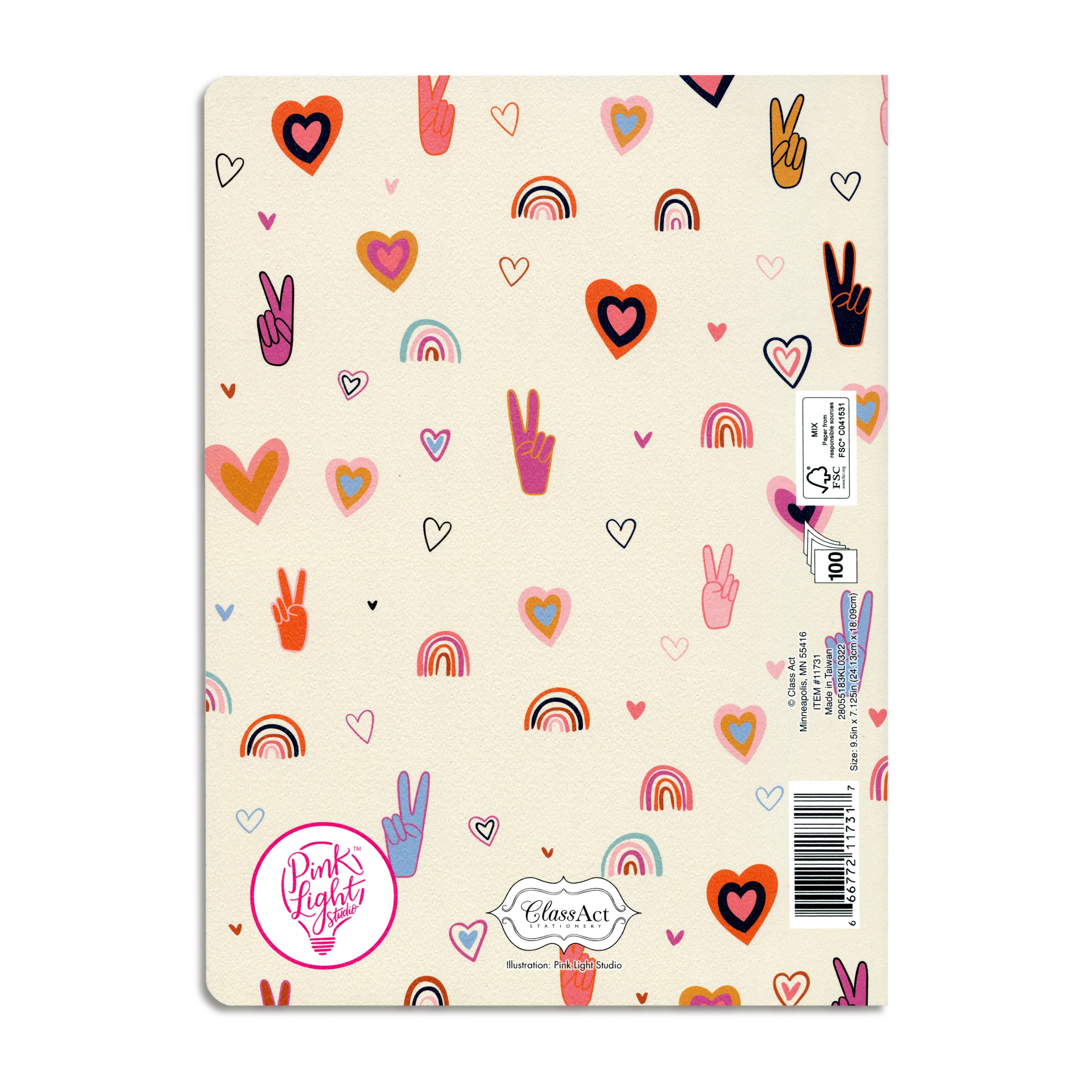 Class Act Stationery 1-Subject stitched bound writing composition book (9.5"x7.125"). Contains 100 college-ruled ivory sheets. This stylish “Love and Peace” composition book by Class Act Stationery has durable textured covers and stitched spine. Features hearts, rainbows, and peace signs. This simple but fun design will be loved by kids of all ages. Perfect for writing notes, to-do lists, homework assignments, school projects, essays, doodling, and so much more.