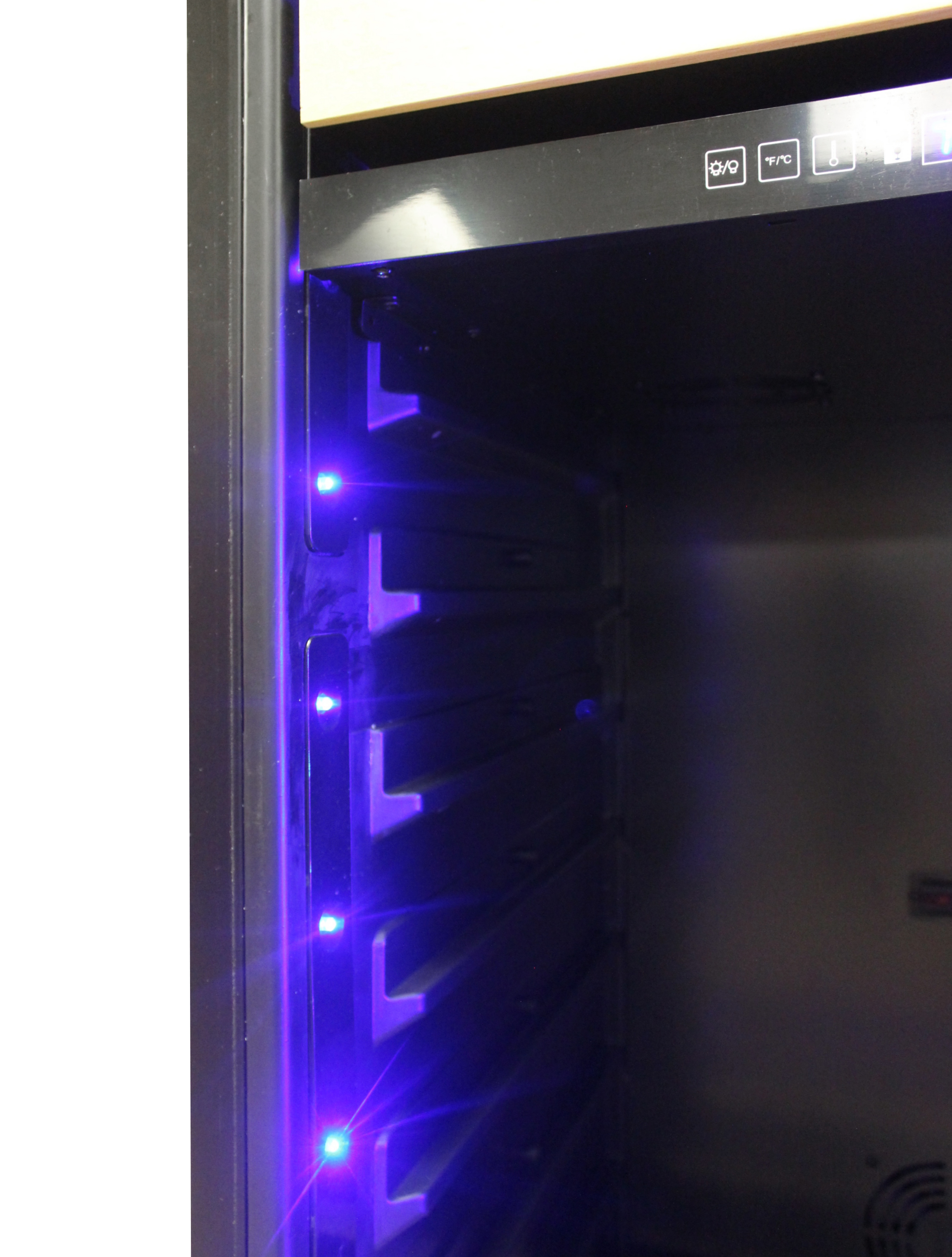 Vinotemp’s Connoisseur Series 168 Dual Zone Wine Cooler is a must-have for the avid wine collector. With two independent temperature zones, this unit is perfect for storing both red and white wines at their optimum temperatures. Specially designed racking has secure-hold grooves that ensure each bottle stays securely in place. A centrally located control panel allows you to monitor and adjust the temperature of this cooler. An insulated glass door with seamless stainless steel trim is accented by a modern pole handle, giving this large capacity wine cooler a touch of luxury. This unit has front venting which allows it to be either installed built-in or freestanding. Store larger sized Champagne and Magnum bottles in the areas designated for bulk storage.Dual-zone wine cooler