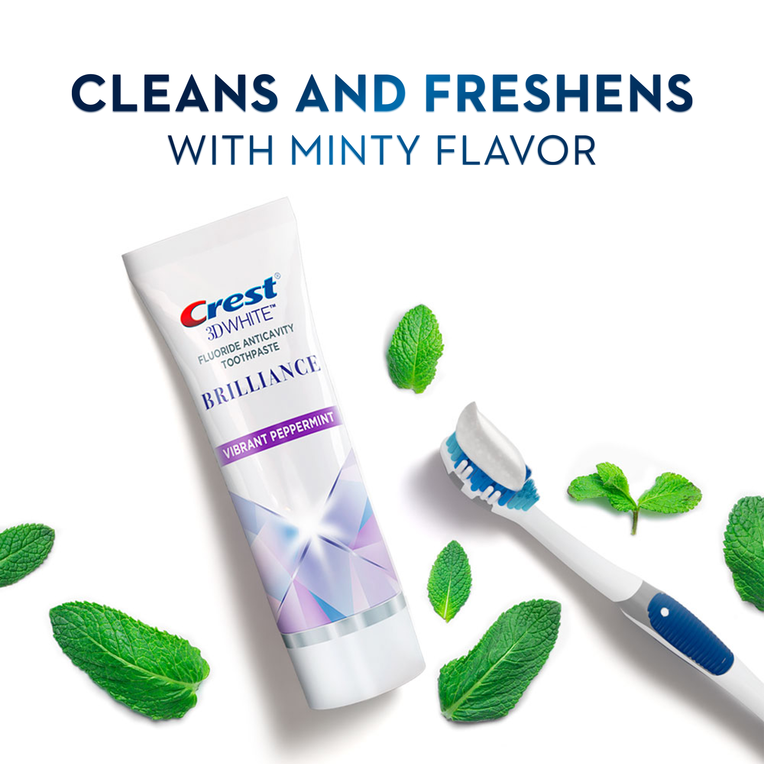 - You will receive (1) 3.9 Oz tube of Crest 3D White Brilliance Toothpaste in Vibrant Peppermint Flavor