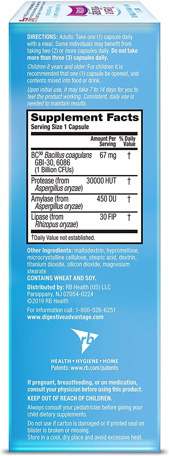 The unique patented probiotic in Digestive Advantage, BC30, is protected by a protein shell which allows it to survive through the harsh conditions of your stomach to reach the intestines where you need it most. It’s the probiotic supplement that survives stomach acid 100x better than yogurt and leading probiotics.