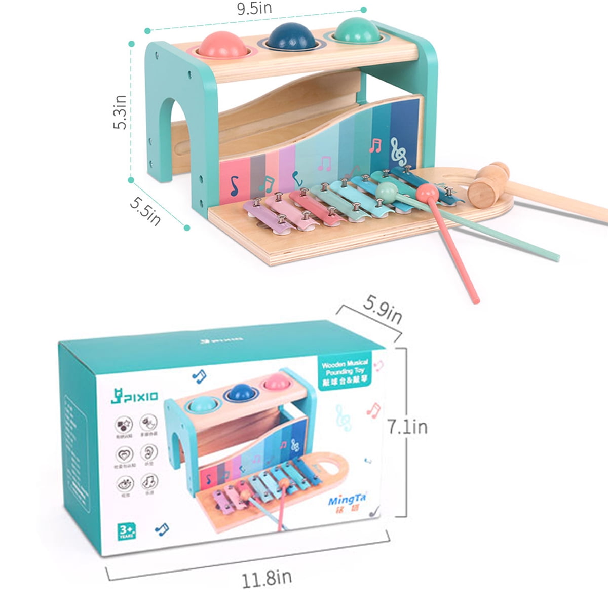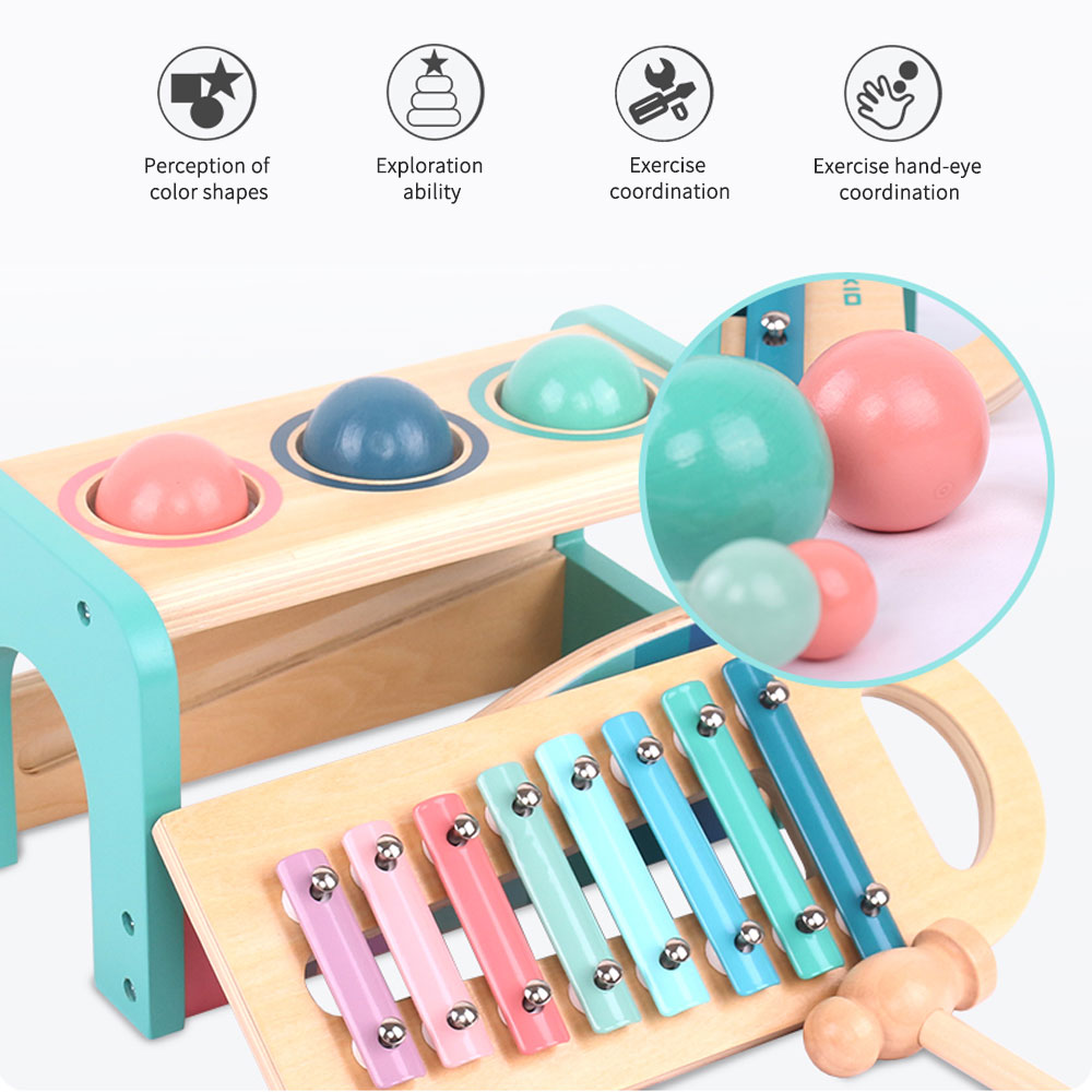 - 【Pound and Tap Bench Music Set】The Hammering & pounding toy include 1 x tap table, 3 x colorful wooden balls, 1 x wooden hammer, 1 x xylophone and 2 xylophone stick. This wooden music hammer toy is safe to use and easy to storage,it is very suitable for boys and girls over 1 year old.