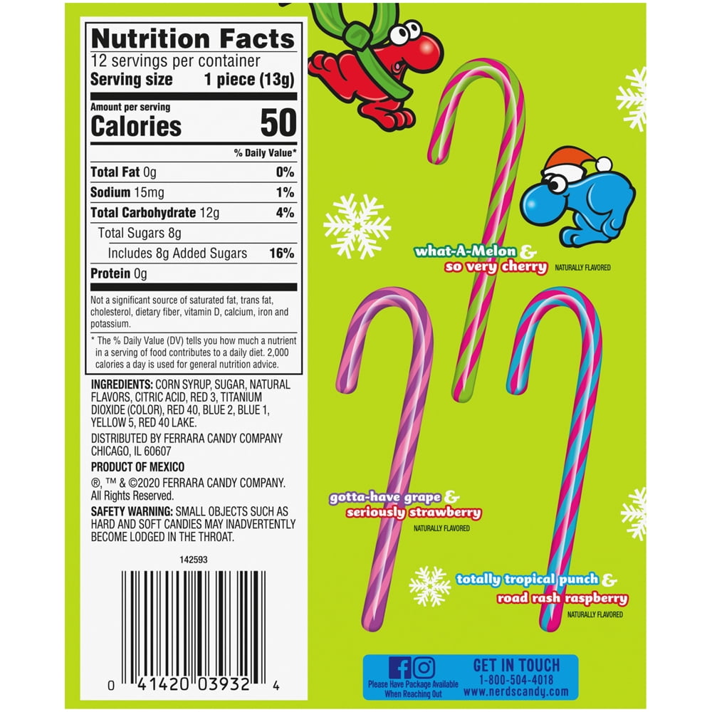 These tangy Nerds Candy Canes are a twist on the typical candy cane. Three flavor combinations include totally tropical punch & road rash raspberry, what-a-melon & so very cherry, and gotta have grape & seriously strawberry. Inidivually wrapped canes are perfect for decorating the tree, holiday treats, or stocking stuffers for the Nerd lover.