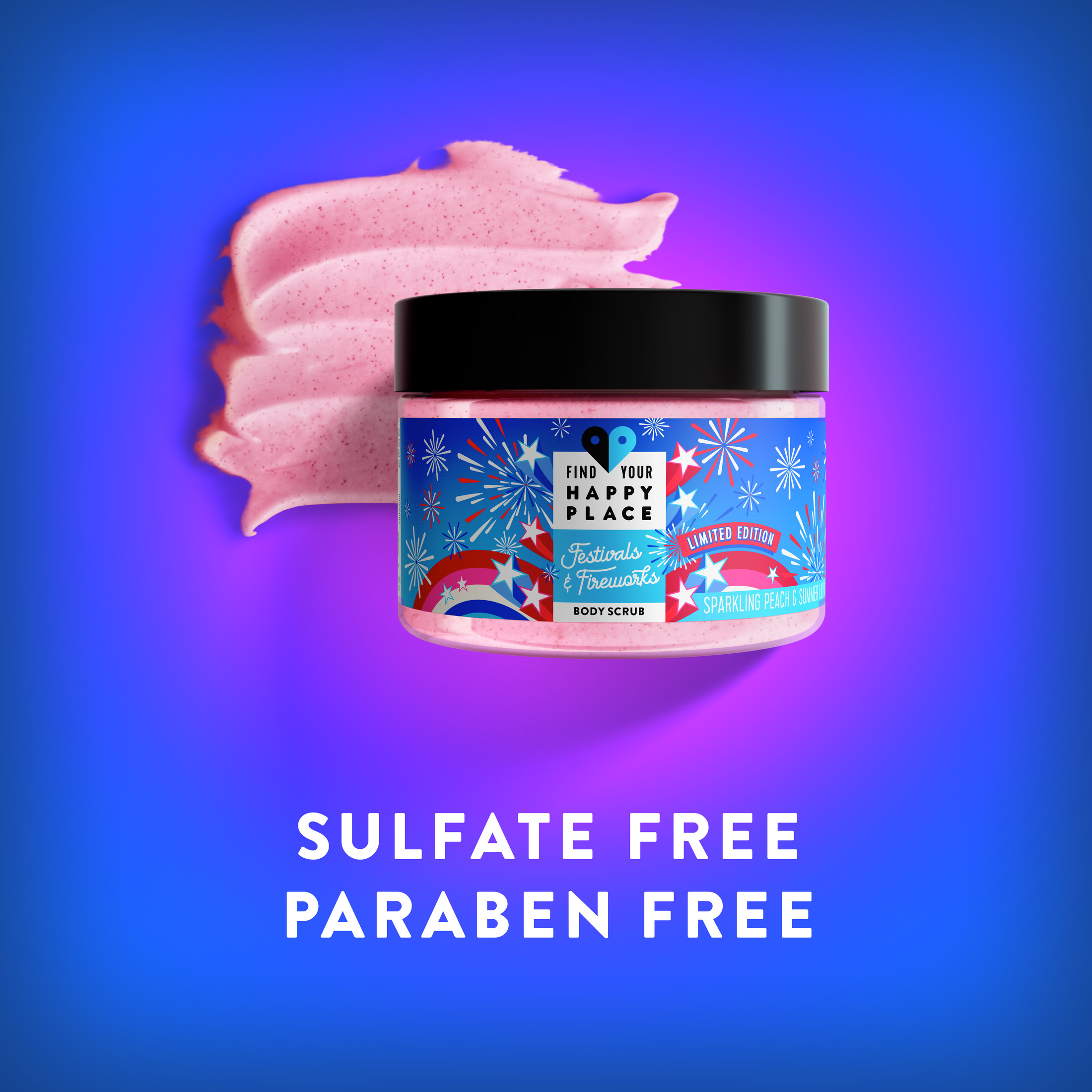 Find Your Happy Place Exfoliating Body Scrub Festivals & Fireworks Sparkling Peach and Summer Lily 10 oz