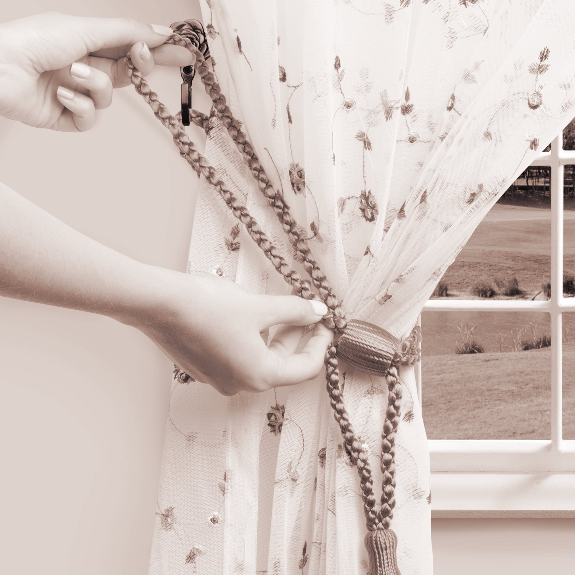 - Tiebacks are single or double tassels attached to a looped cord and are used to dress and hold back curtains from the window.
