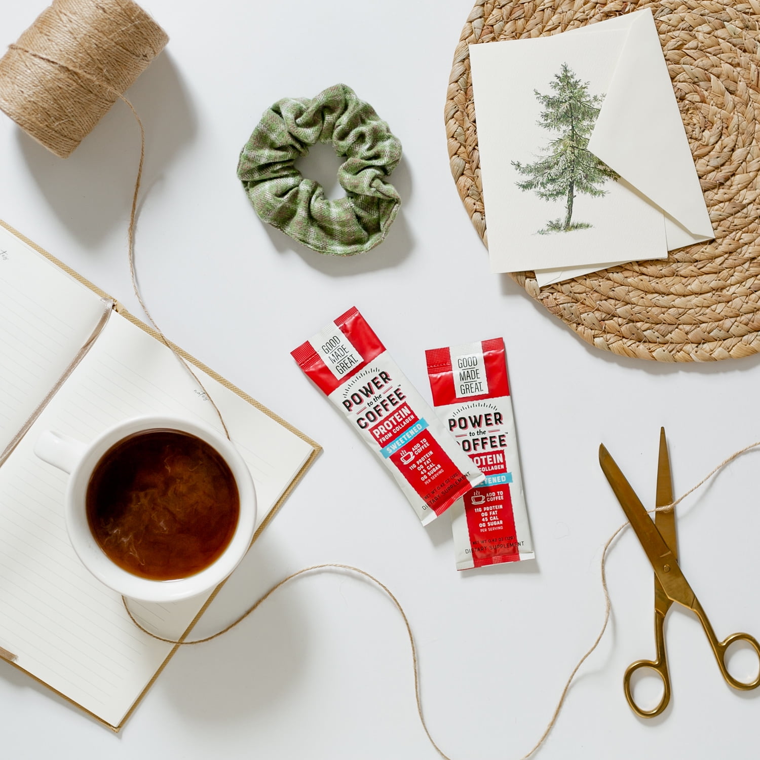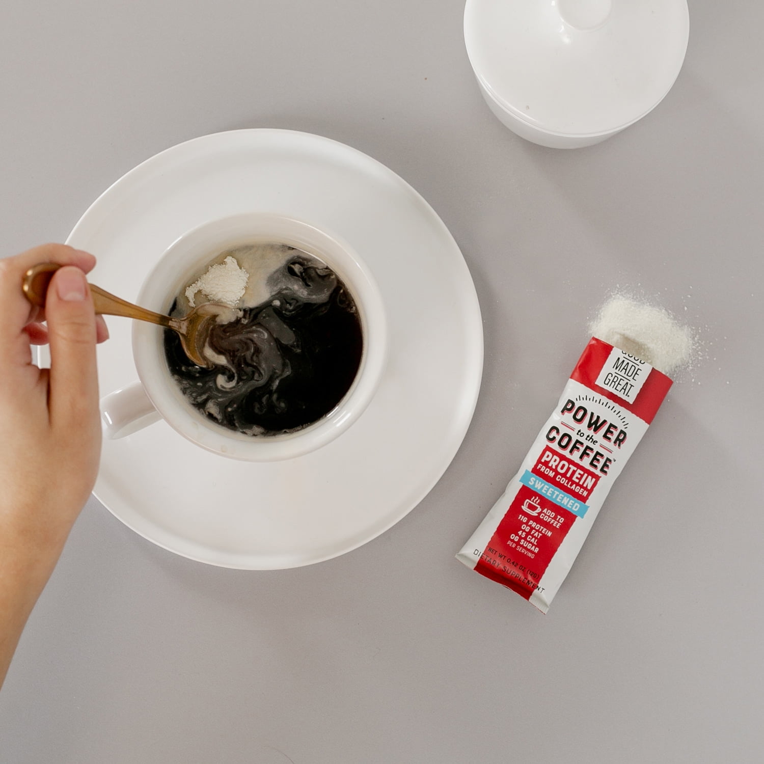 Good Made Great Foods Power to the Coffee 6-pack sweetened collagen protein supplement comes in individual stick packs that you add to your morning coffee, or tea. Each sweetened stick pack has 12g of high-quality collagen peptides, for a total of 11g of protein, and is sugar-free with no extra calories! We use a blend of stevia and monk fruit for the perfect hint of sweetness without any aftertaste.