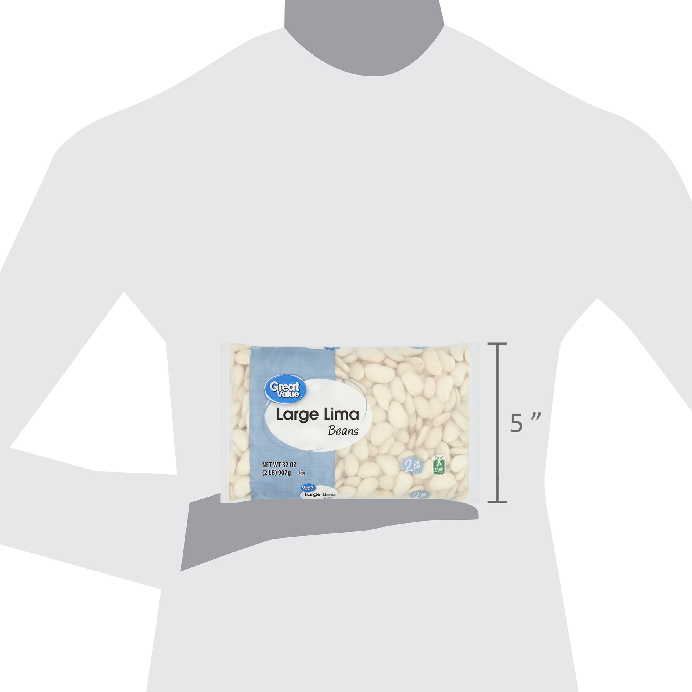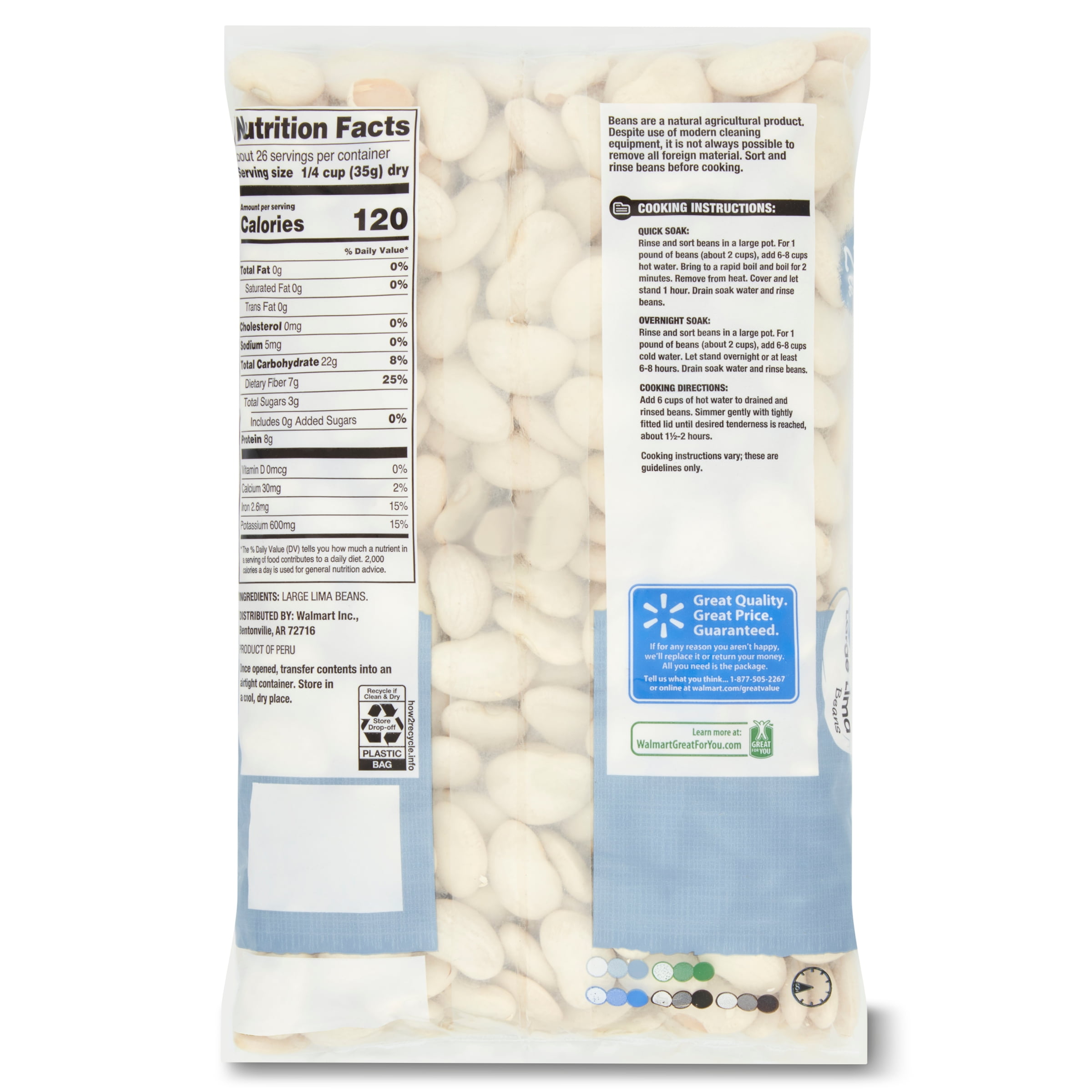 The robust flavor and nutritional benefits of Great Value Large Lima Beans make them an all-in-one meal. They can be cooked to a savory, buttery, earthy flavor that complements a wide variety of dishes. Bring them to life with onion, garlic, and seasonings, add to skillet recipes, or make the best ever succotash. These beans have earned our "Great For You" label designation, because they are free of saturated fat, trans fat, and cholesterol, packed with vitamins and minerals, and are a great source of dietary fiber. This 32-ounce bag of our large lima beans stores well and serves many. In addition to being a tasty meal option, Great Value Large Lima Beans are an ideal staple for a healthy, balanced diet.