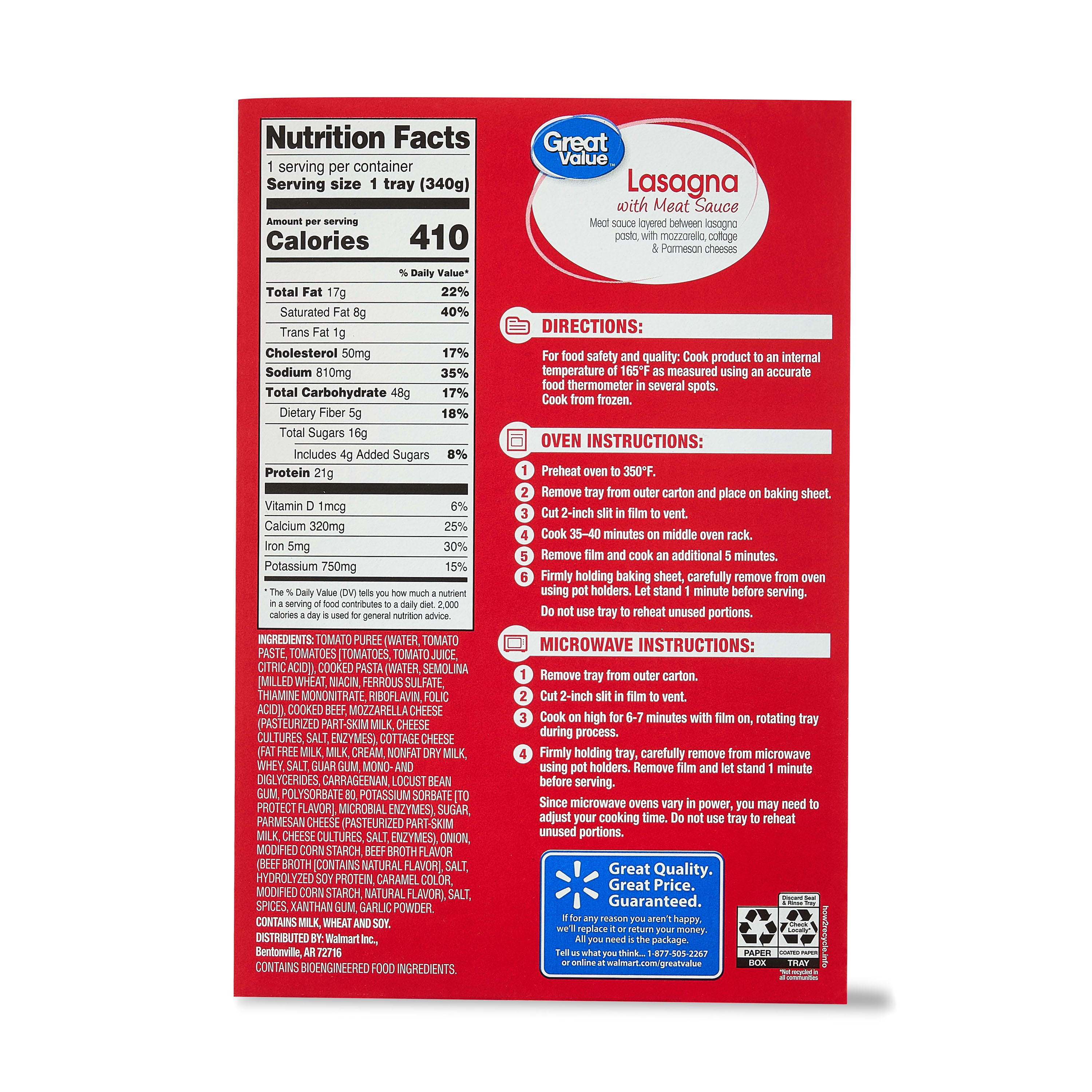 Whether you are a busy student or a working professional, you will love the satisfying flavors and convenience of Great Value Lasagna with Meat Sauce. This 12-ounce tray contains a single serving of delicious meat sauce layered between lasagna pasta, with mozzarella, cottage, and Parmesan cheeses. It can be prepared easily in the microwave or oven and makes a hearty meal when paired with a salad or vegetable. You’ll have delectable comfort food in a flash when you enjoy Great Value Lasagna with Meat Sauce for your next dinner.