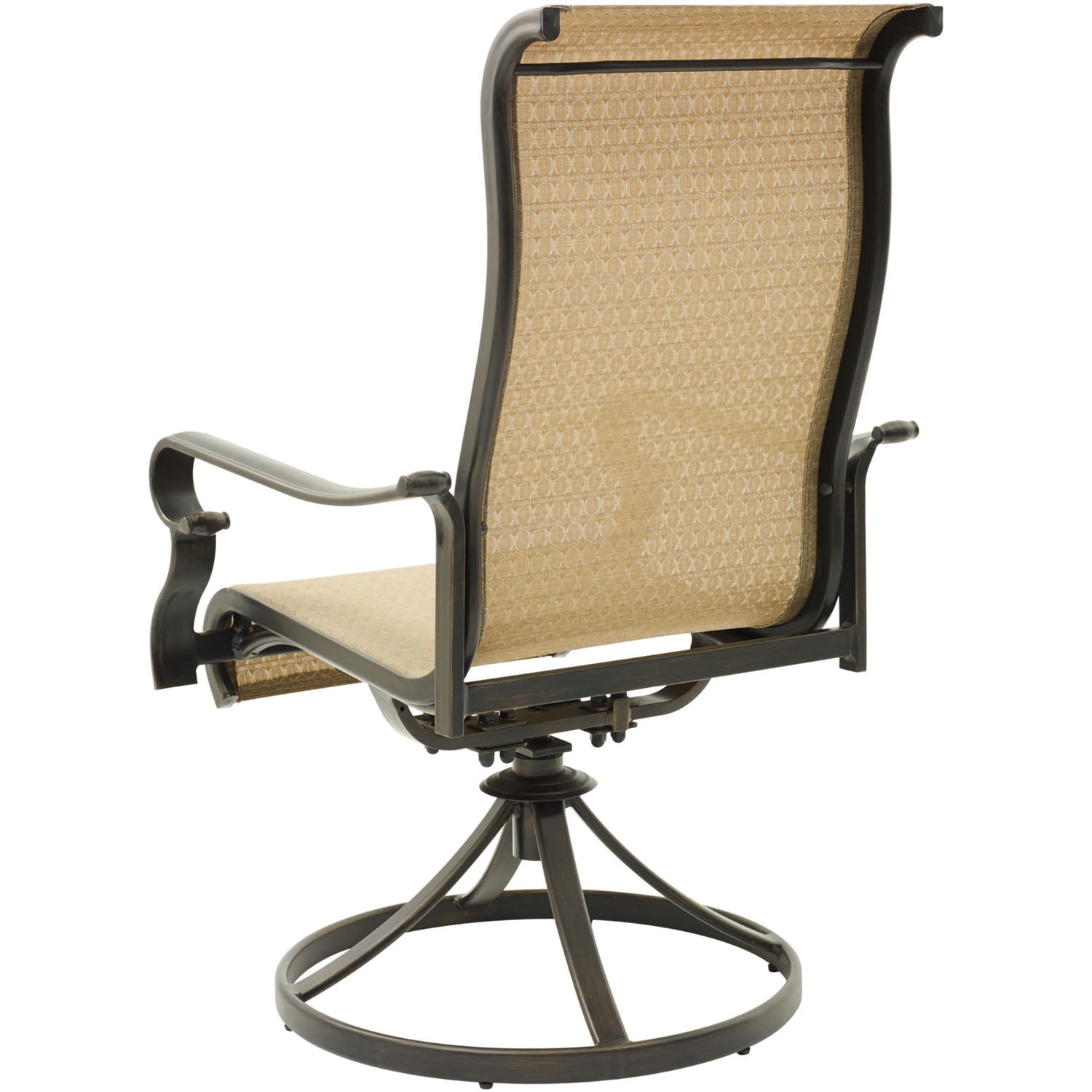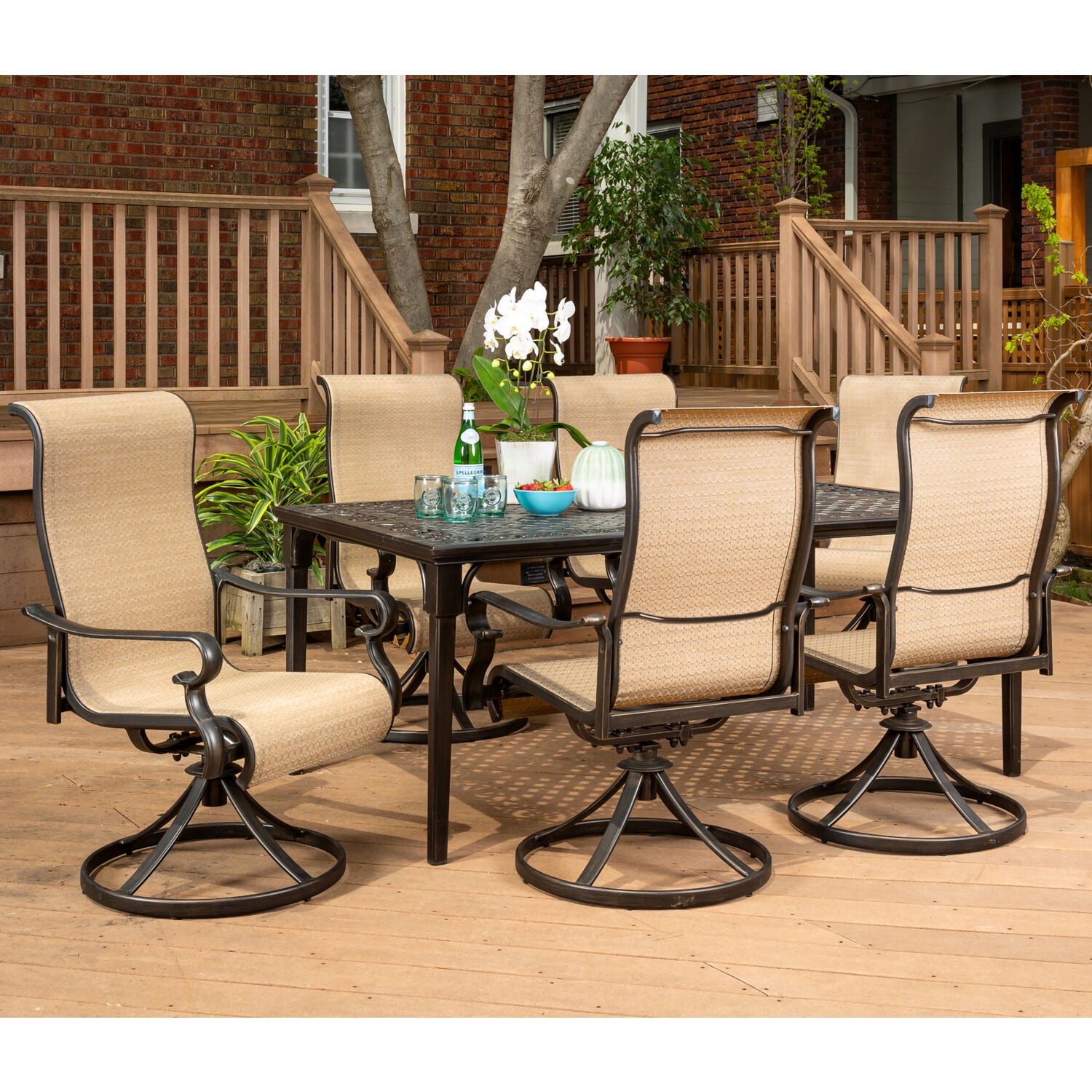 - COASTAL DESIGN: The Brigantine Dining Collection by Hanover includes stylish and elegant sling back chairs and large cast-top table. This set includes six (6) sling back swivel rockers and a 70 x 40 in. dining table. It is the perfect addition to your patio, backyard, deck, or porch. Designed for durability for long lasting use to enjoy for many years.