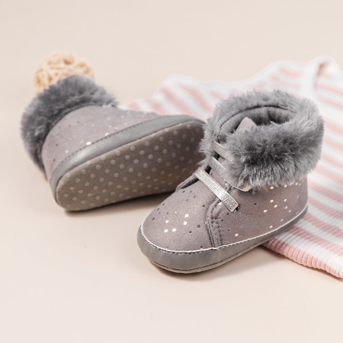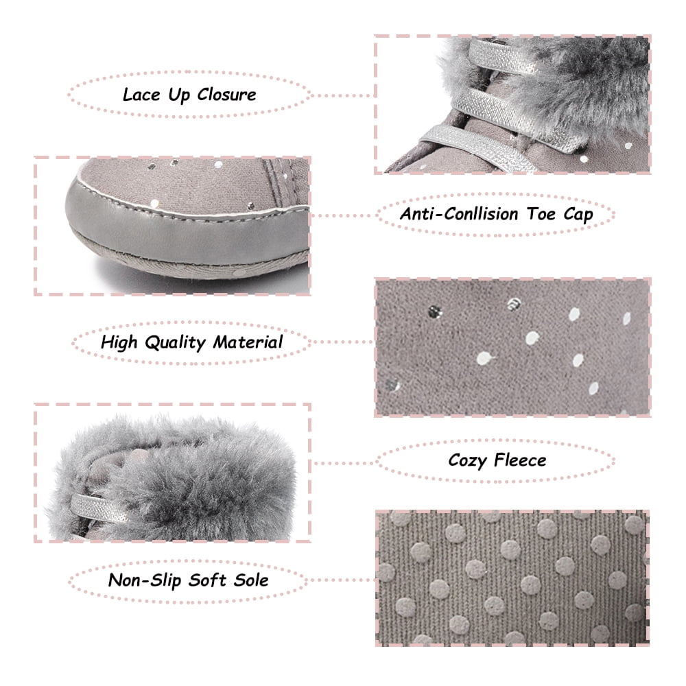 - SKIN-FRIENDLY – The baby girls boys booties with high quality cozy fleece, which will keep warm for newborn baby in winter.N on-slip soft sole for first walkers 0-18months .
