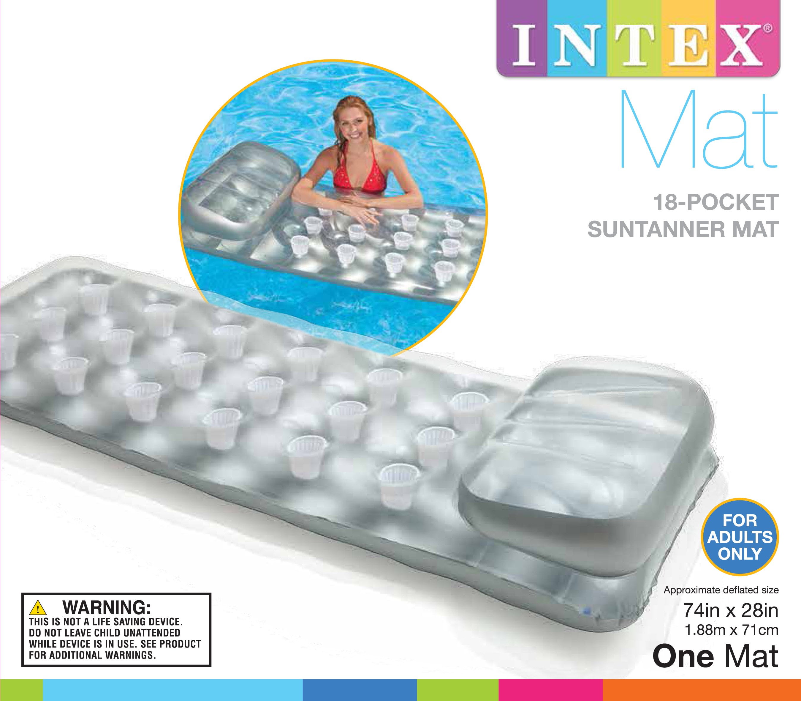 Soak up the rays while relaxing on the Intex Suntanner Lounge. This inflatable pool float features a comfortable built in pillow for extra comfort. The 18 pockets even double as cup holders! This float is in the style of french coil beam style air mattress, a classic pool staple. The mattress shape is supportive and comfortable, and its 11 gauge vinyl top and 12 gauge bottom makes it extra durable. Nicknamed the Suntanner, this float is an open pool lounger and allows for the most sun to hit your skin so you can get an even tan. The transparent top won’t get hot to the touch, so sunbathe in comfort! This floating lounge is the right choice for a warm day out on the water.