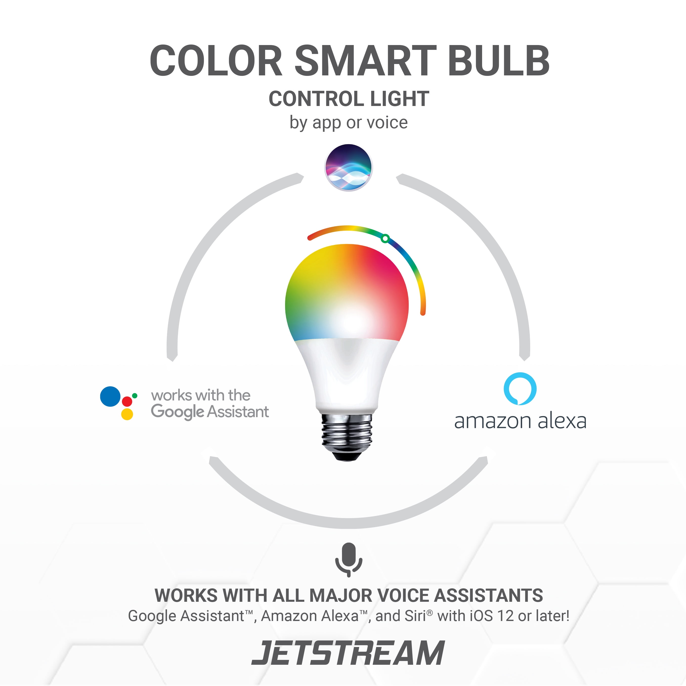 The Jetstream 9W Color Smart Bulb offers up to 25 thousand hours of bulb life, dimmable brightness, and more than 16 million color choices. Connect this nine-watt, 120-volt LED bulb to Wi-Fi (no hub required) and download the Jetstream Home App to set automatic on/off times or change the color. When you connect to the app, you can control your home from wherever you go or share access with multiple users. Plus, Jetstream technology works will all major voice assistants, including Amazon Alexa and Siri. Enjoy easy setup as well as ongoing convenience with the Jetstream 9W Color Smart Bulb.