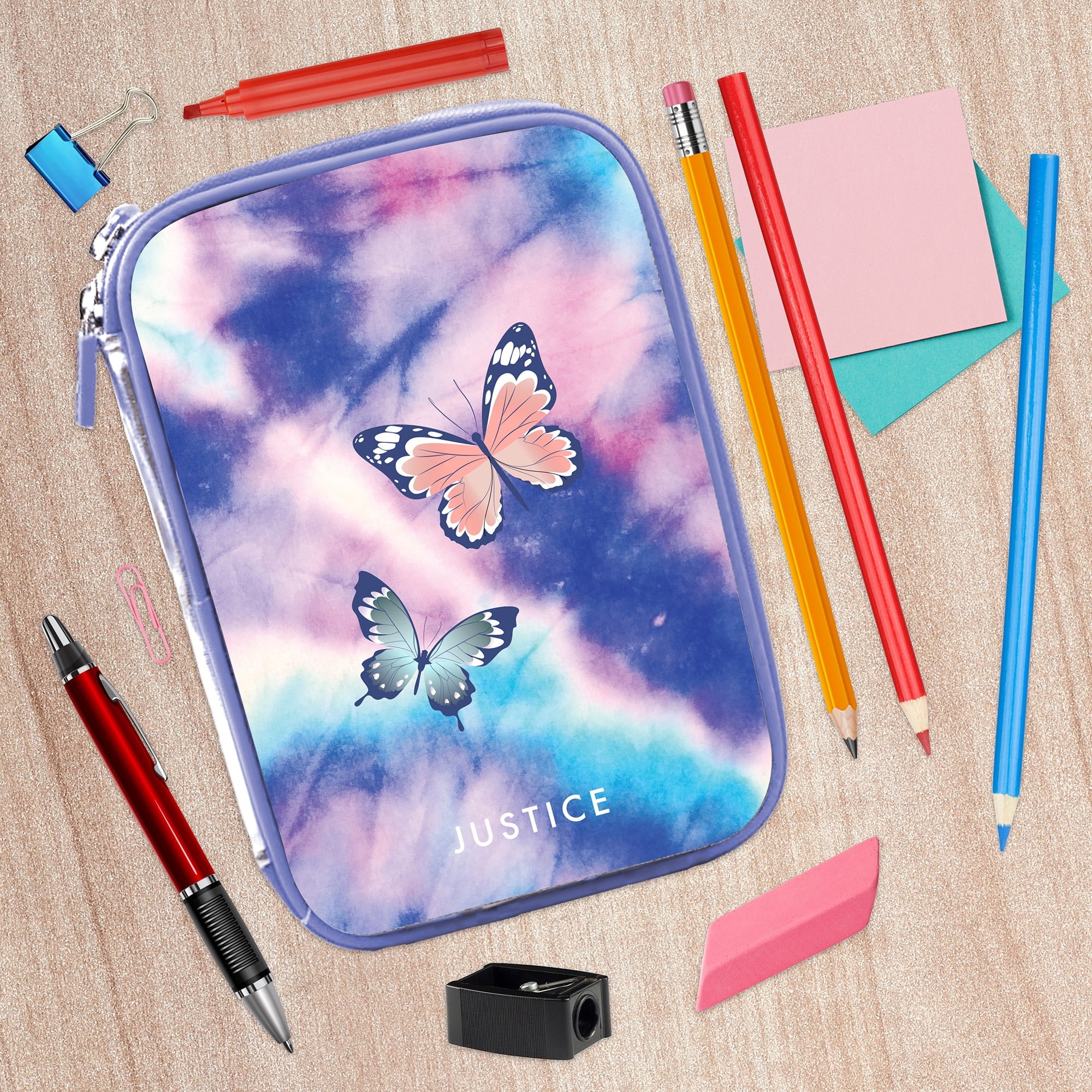 The Justice Metallic Blue Butterfly Zipper Pencil Case is super cute! A splash of purple, blue, sky blue, and white cover the front of the pouch. The front shell of the pouch is a metallic silver color. It can be used for everything from pencils to paperclips. The pouch makes a perfect money holder or beauty product storage bag too. Overall dimensions of the pencil pouch are 9.5" Length x 7" Height.