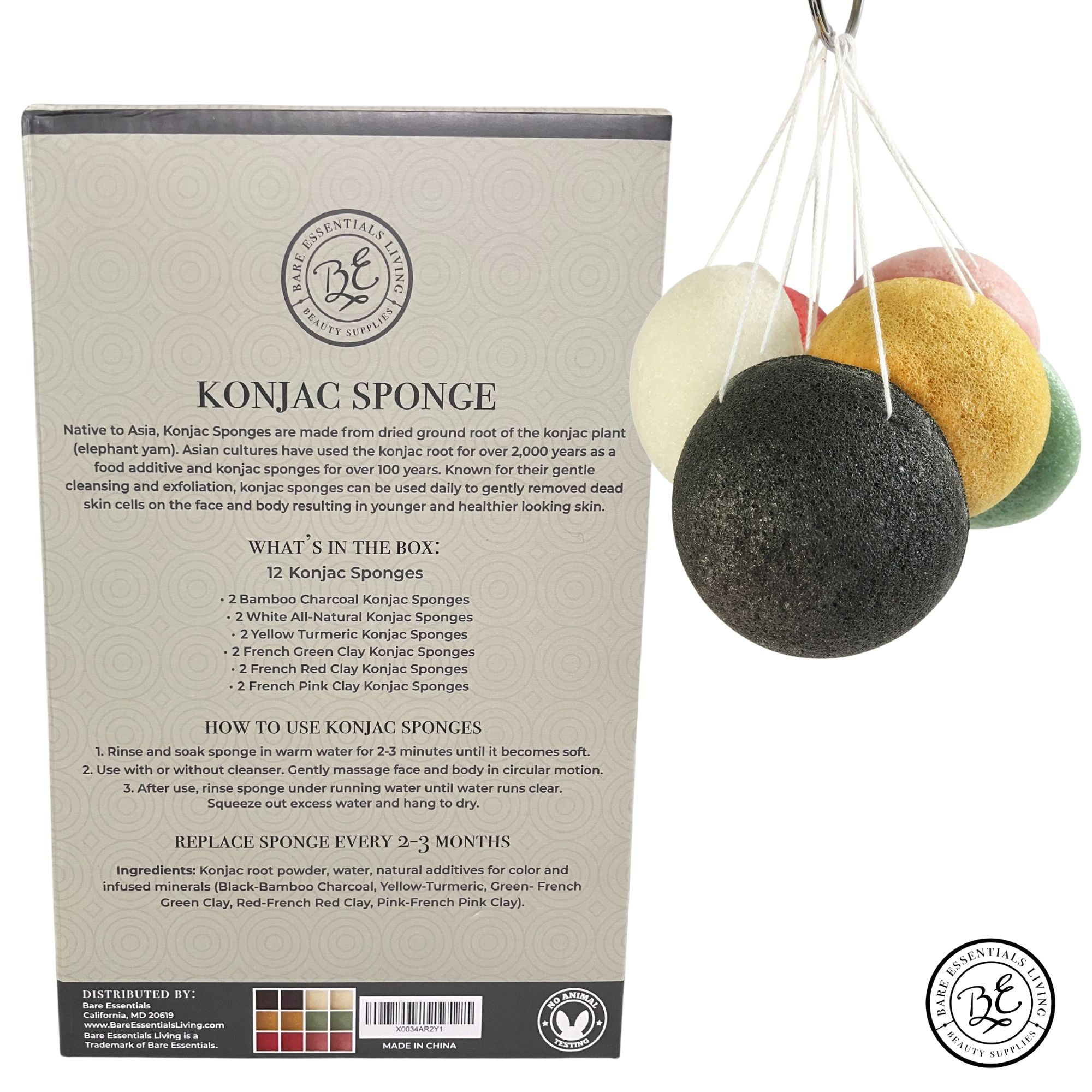 - IN THE BOX: Konjac Sponge 12 Pack Bulk Set. 2 Konjac Sponges Infused with Activated Charcoal and 2 Variety Konjac Sponges- 2 Each Plain, Turmeric, Green Clay, Rose/Pink Clay and Red Clay.