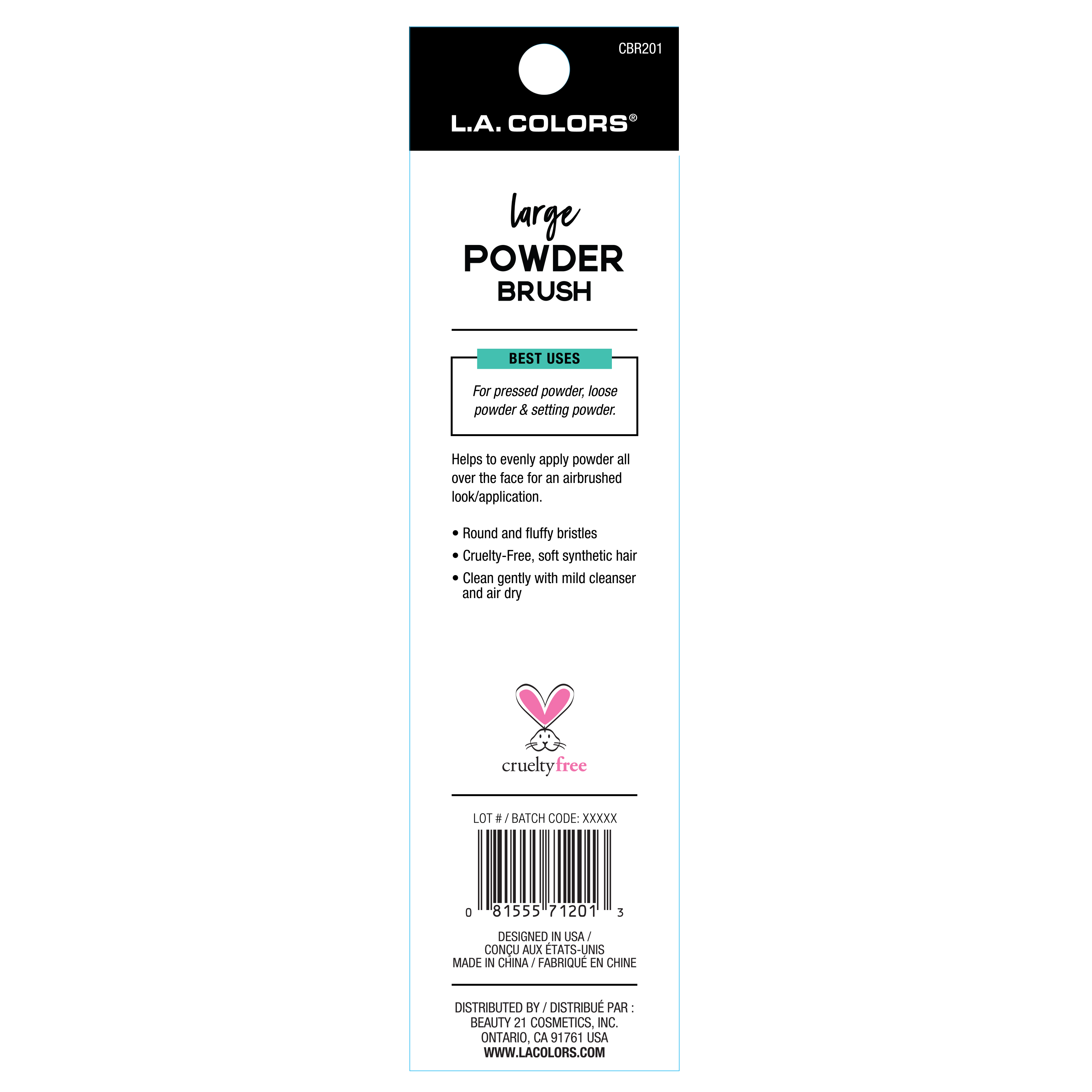 Create a flawless finish for your base with the L.A. COLORS Large Powder Brush. This well-designed face brush is made with soft synthetic duo-toned hairs to evenly apply powder all over the face for an airbrushed look. Its round, fluffy bristles are perfect for picking up a variety of face powders: buff and blend pressed or loose powders to set foundation in its place. This lightweight makeup brush is suited for all skill levels – from beginner to pro, this is an essential brush for any makeup lover’s kit. To clean, wash with a mild cleanser and hang/air dry with bristles pointing down.L.A. Colors Large Powder Brush, 1 pc • Large powder face brush • Best used with pressed powder, loose powder, and setting powder • Soft, synthetic bristles • Clean as needed to maintain optimal brush performance • Cruelty-free • L.A. Colors Large Powder Brush can be used with L.A. Colors range of face cosmetics • Other L.A. Colors cosmetics products sold separately