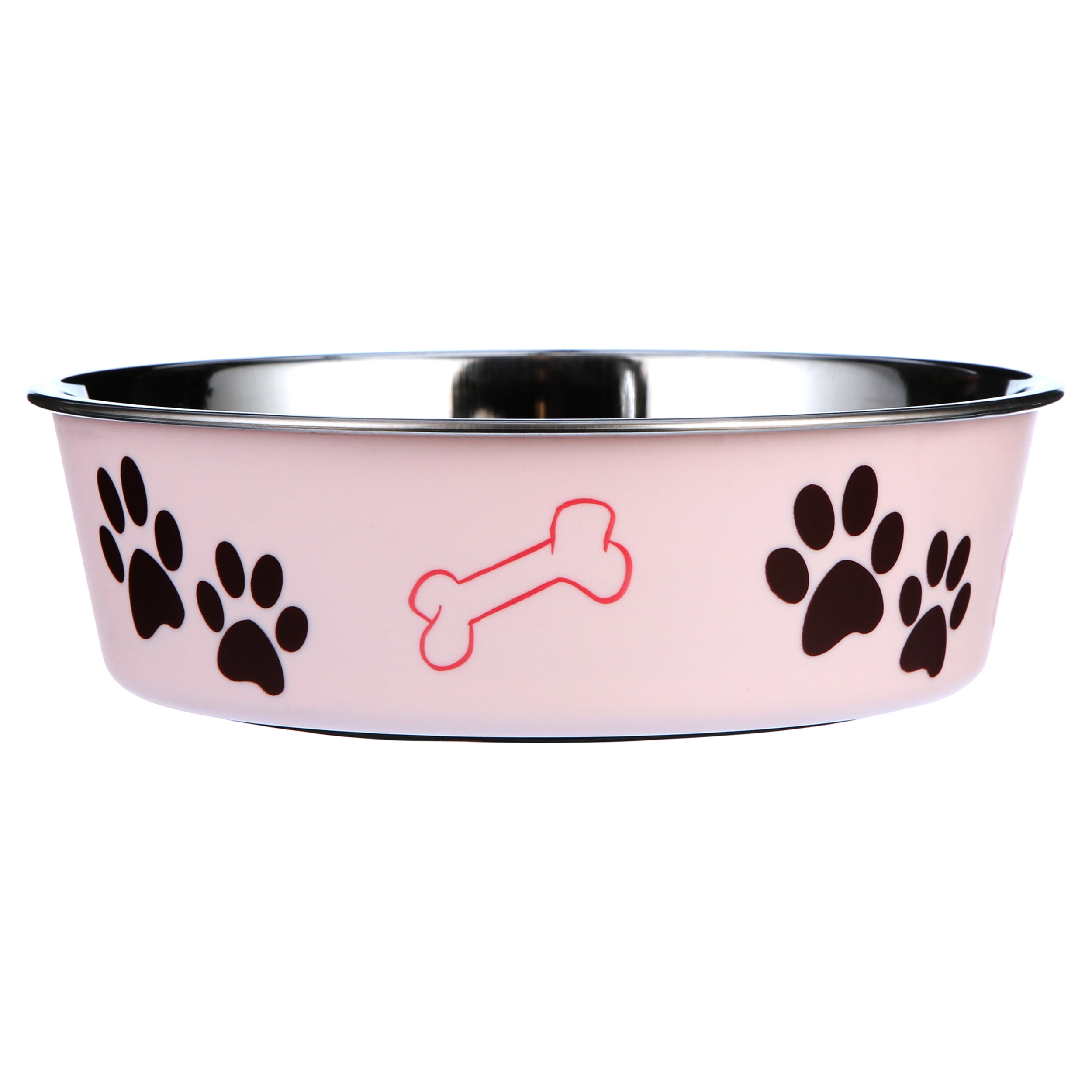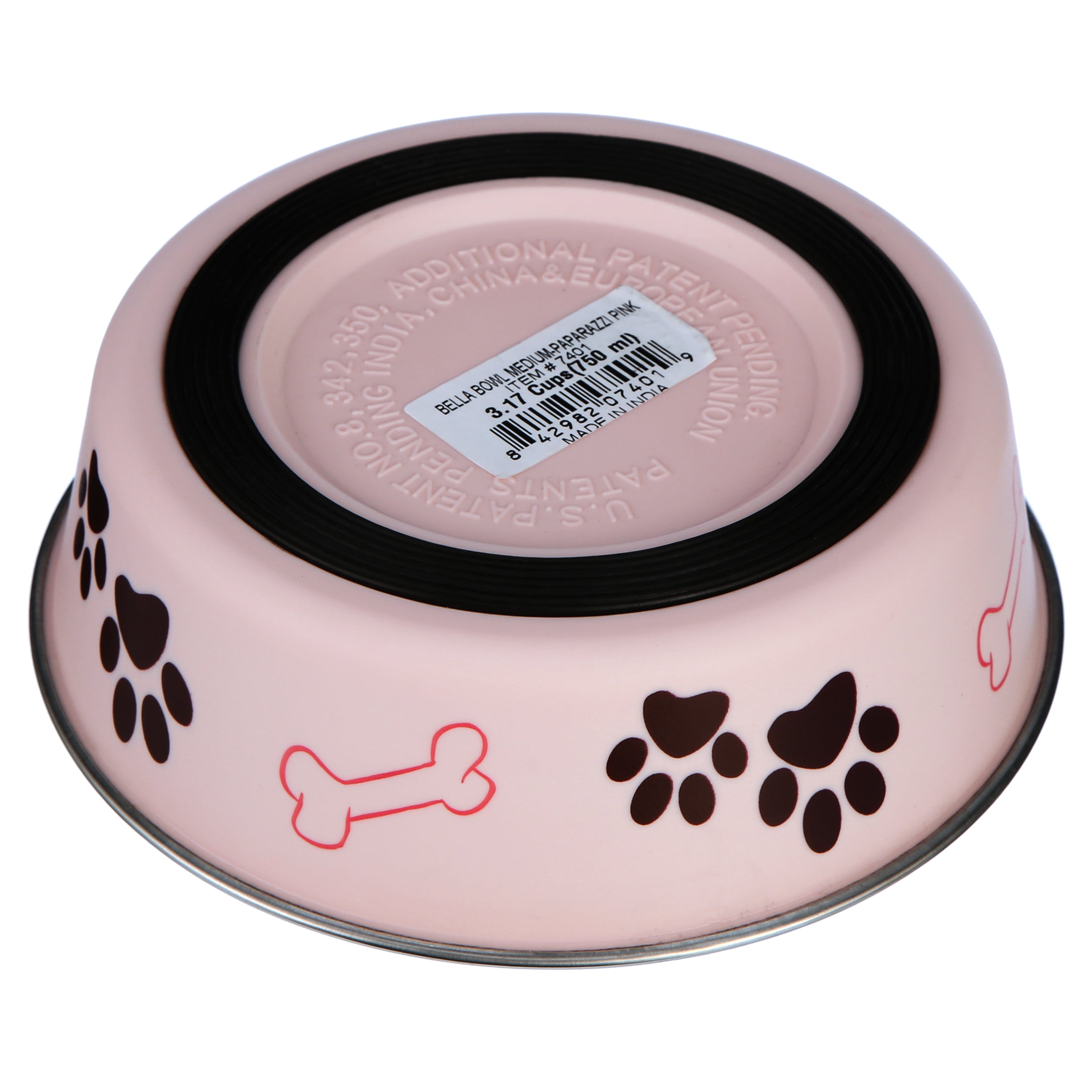 Loving Pets® Bella Bowl Medium Paparazzi Pink. Made with vet-recommended stainless steel interior, which resists bacteria. The removeable rubber base prevents spills and noise. Stops gulping, helps prevent bloat. This bowl is dishwasher safe.