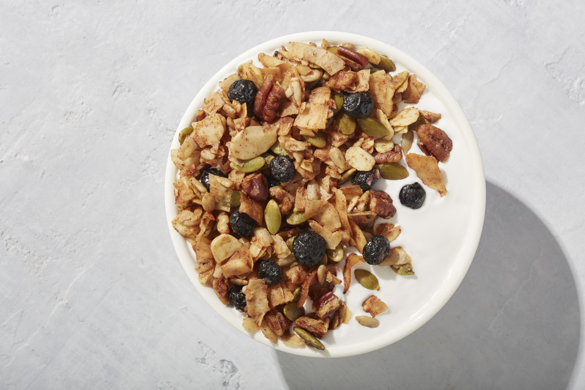 Ingredients: Sliced Almonds, Sunflower Seeds, Pumpkin Seeds, Coconut Chips, Pecans, Erythritol, Monk Fruit Extract, Butter (Cream, Natural Flavor), Freeze-Dried Blueberries, Cinnamon, Salt