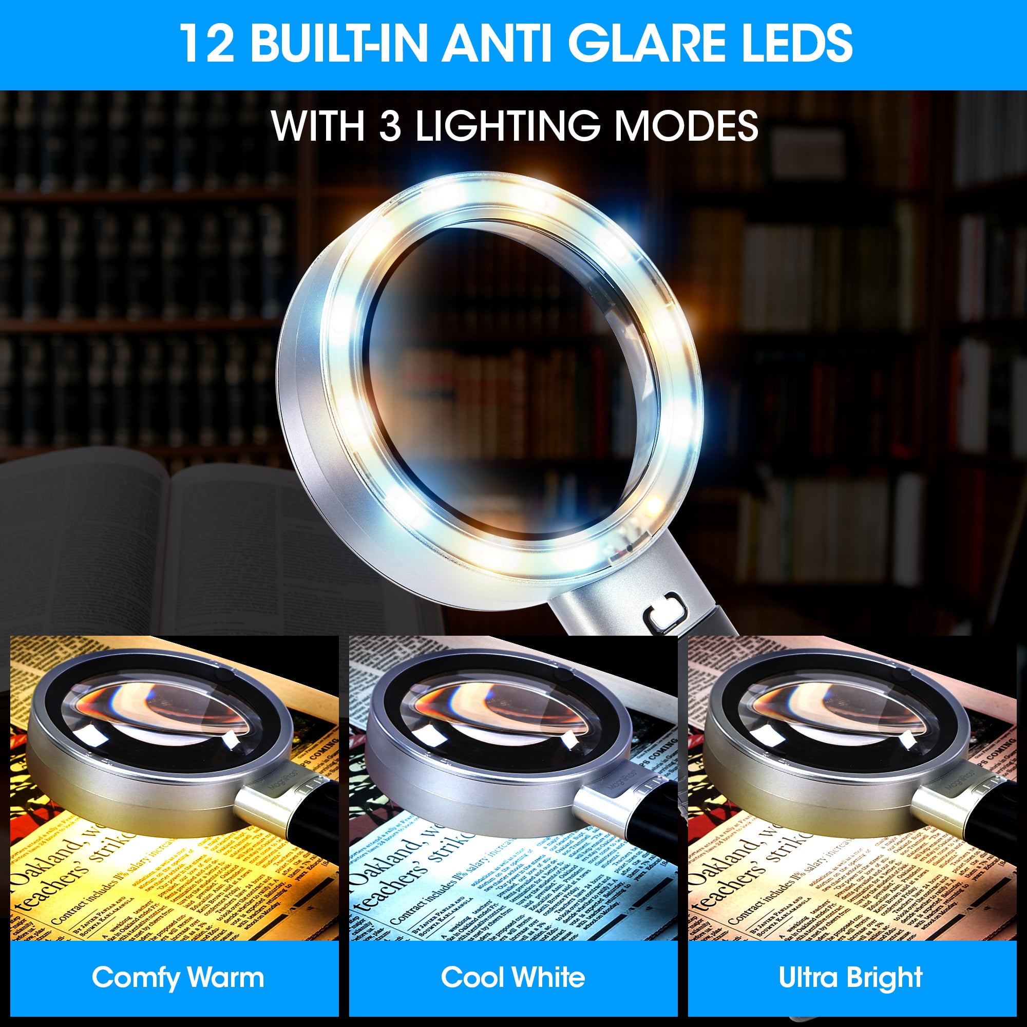 - ★ FULLY DIMMABLE ON 3 LIGHT MODES: MAGNIPROS magnifying glass adopts the latest and easy-to-operate ONE button design to switch and adjust brightness between 3 lighting modes (cold, warm and mixed) based on different conditions/tasks. These 12 SMD LEDs are energy efficient(consume 40% less energy than traditional LEDs) and would last 100,000+ hours.