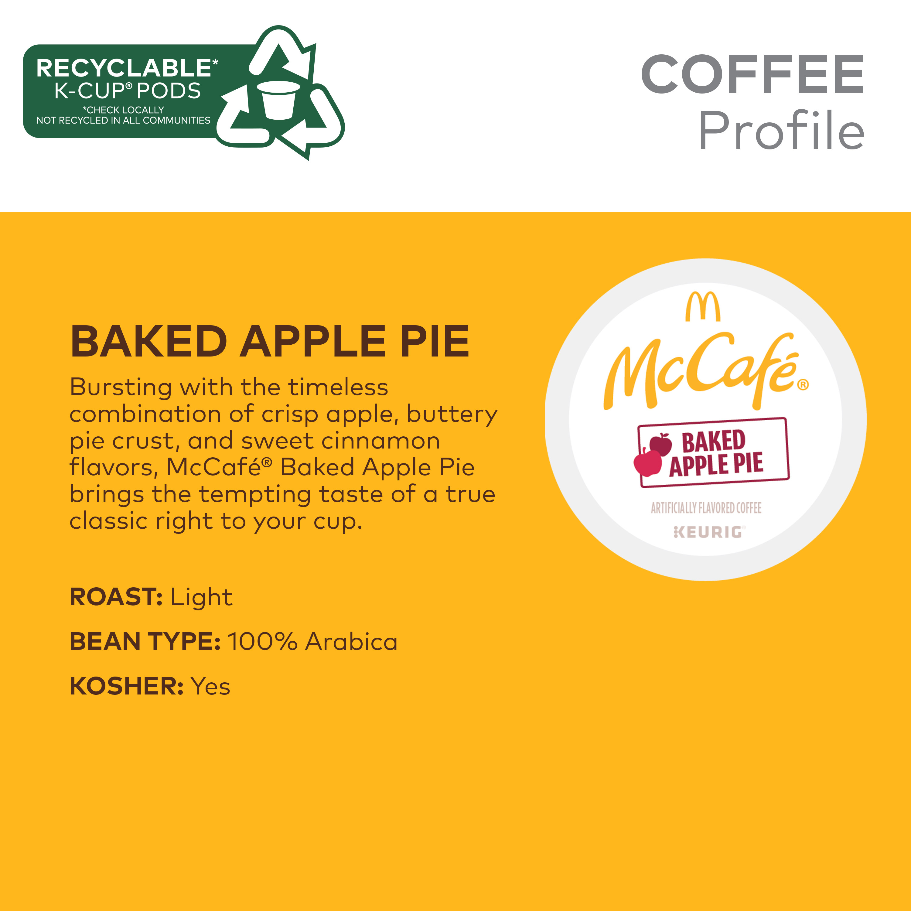 Bursting with the timeless combination of crisp apple, buttery pie crust, and sweet cinnamon flavors, McCafe Baked Apple Pie brings the tempting taste of a true classic right to your cup.We start with 100% premium Arabica coffee beans, carefully harvested from the rich soils and mountainous regions of the foremost coffee-growing areas of the world. Then we expertly roast them in a temperature-controlled environment to bring out the best taste in every cup, every time. Brew a cup of McCafé Baked Apple Pie in all Keurig brewing systems. To keep the good going, we use only 100% Responsibly Sourced coffee. That means we support a healthier planet and an improved quality of life for farming communities. This package contains medium roast, caffeinated coffee from 100% Arabica beans. They have been certified Orthodox Union Kosher. With this purchase, you can be assured of premium quality. Simple. Delicious. Brew good by the cupful.