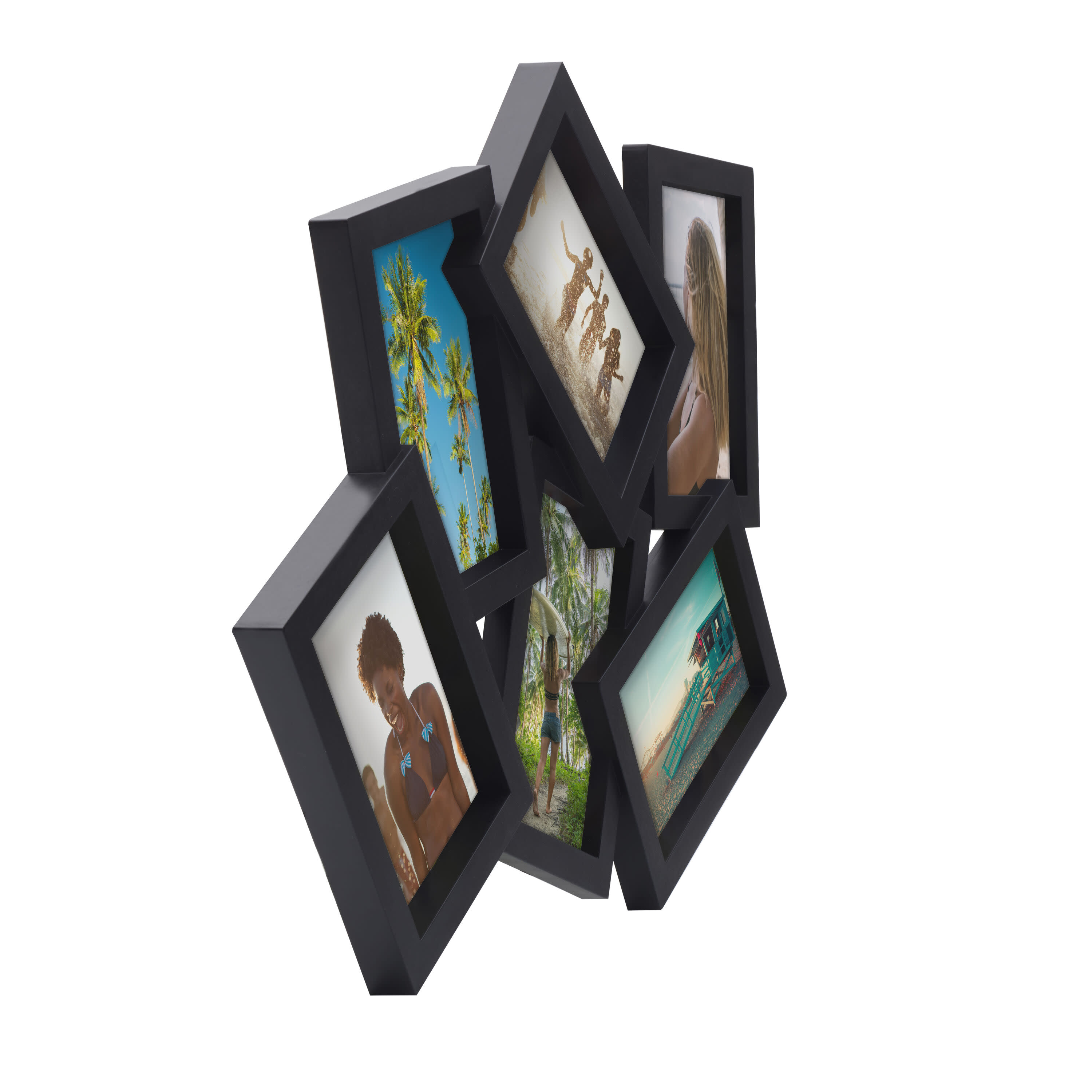 Keep it cool while displaying your favorite fun photos with this Melannco 6-Opening Jumbo Wall Collage Frame. Made of plastic with a bold, contemporary black finish, this whimsical photo wall display features 6 overlapping, angled frames to create an eye-catching sense of movement while highlighting your memorable moments. Holds six 4 x 6 inch photos. Measures 18 x 15 inches.