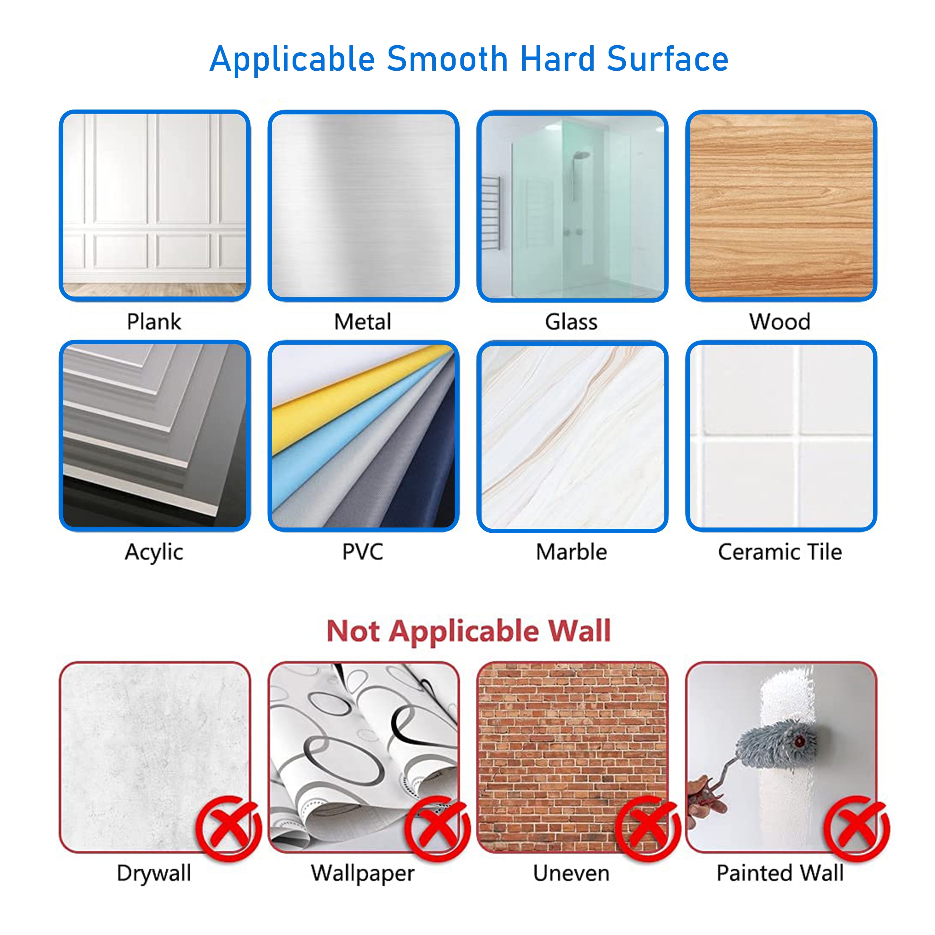 - Not applied to drywall, wallpaper, uneven and painted walls.