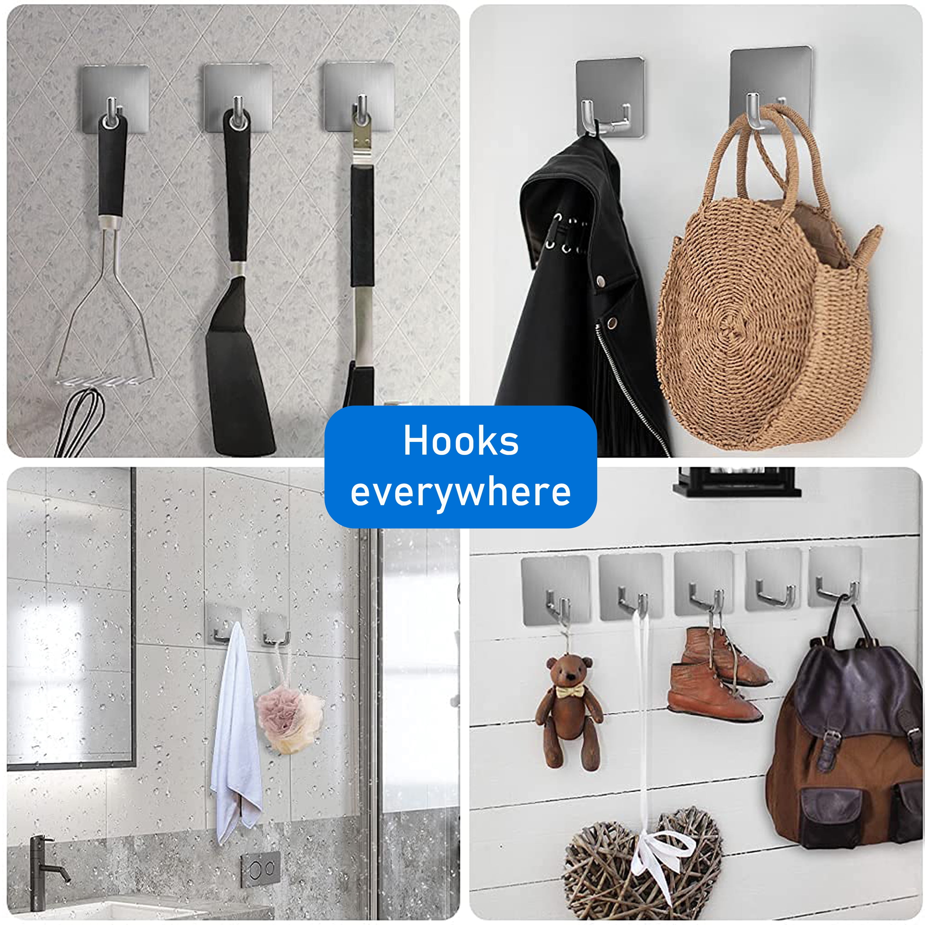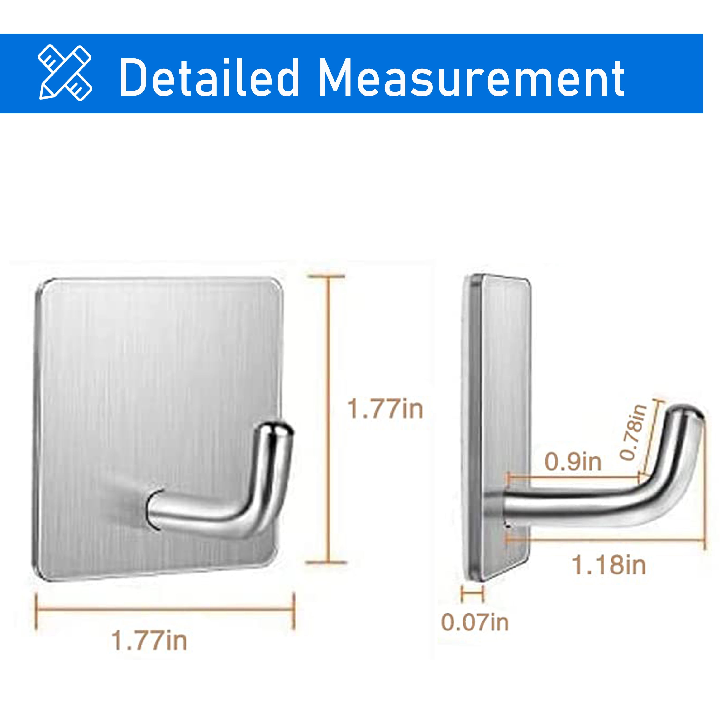 - Widely and Versatile adhesive hooks: These stainless steel hooks especially suitable for bathroom, kitchen, living room, office, home and outdoor hanging accessories and tools. As wall mount coat rack, wall hooks, door hook hanger, key hook, kitchen hooks, hanging hook, ceiling hook, seamless hooks etc. Help you to organize cooking tools, umbrellas, towel, coat, robe, key, clothes, hat etc.