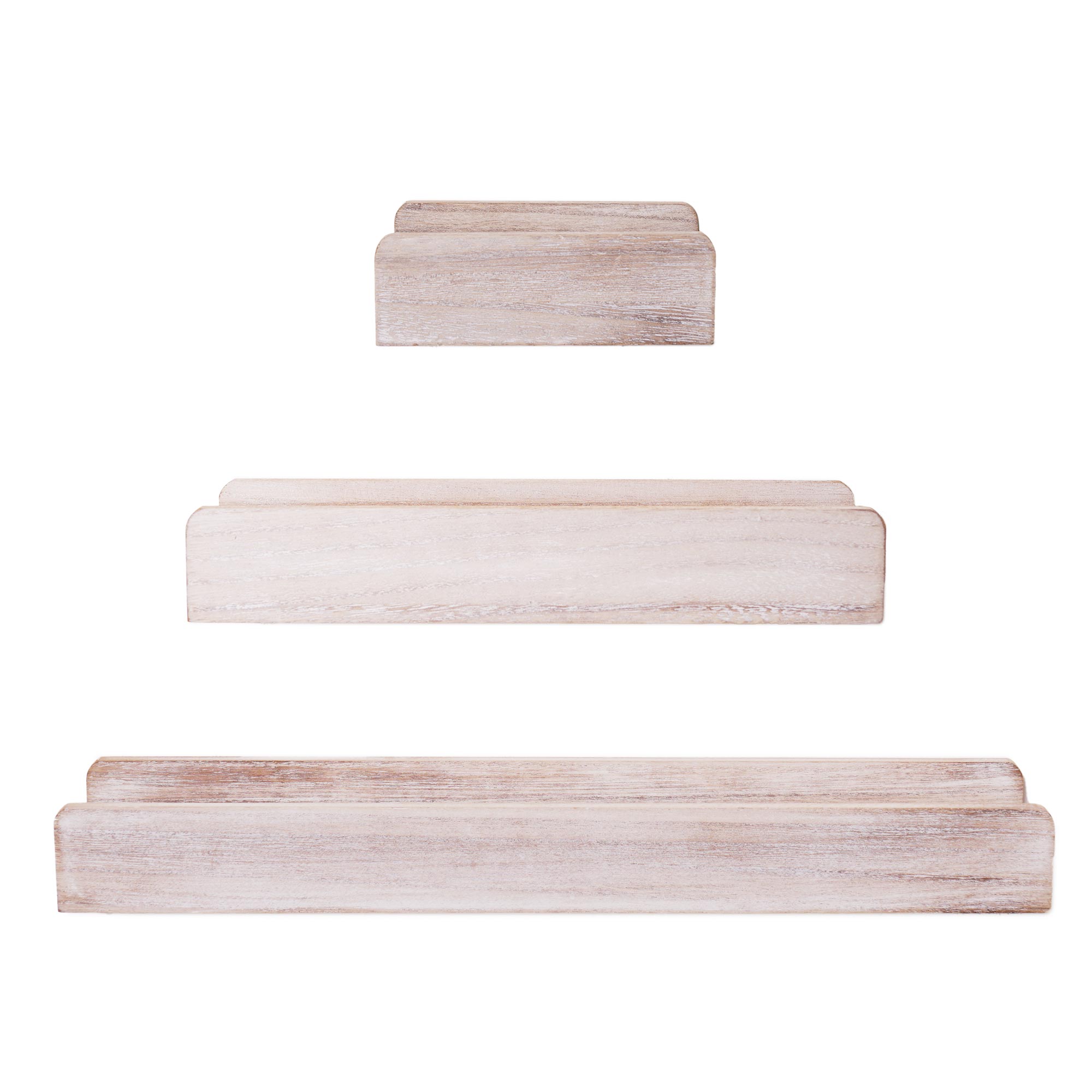 Make life a little neater with the addition of this 3-piece whitewashed ledge shelf set in different sizes. Use to store glassware, vases or sentimental figurines. Painted in a light grey, this set will look lovely with any color palette or decor style.