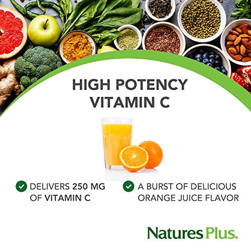 Orange Juice C 250mg by Nature’s Plus 90 Chewable Orange Juice C 250mg 90 Chewable Product Chewable Orange Juice In a natural base containing lemon bioflavonoids rutin hesperidin acerola cherry rose hips papaya green pepper extract and black currant concentrate. Hypo-allergenic. Suggested Use As a dietary supplement chew one tablet daily – Or as directed by your healthcare professional. Supplement Facts Serving Size 1 Chewable Tablet Servings Per Container 90 Amount Per Serving Daily Value Calories 5 Total Carbohydrate 1 g 1 Sugars 1 g Vitamin C (as ascorbic acid) 250 mg 417 Percent Daily Values are based on a 2 000 calorie diet Other Ingredients Fructose natural orange flavor magnesium stearate silica beet juice natural color natural orange juice pulp orange juice crystals orange exocarp lemon bioflavonoids (from citrus limon fruit) rutin hesperidin acerola cherry (malpighia glabra fruit) rose hips (rosa canina fruit) papaya fruit green pepper extract (from capsicum annuum fruit) bla.